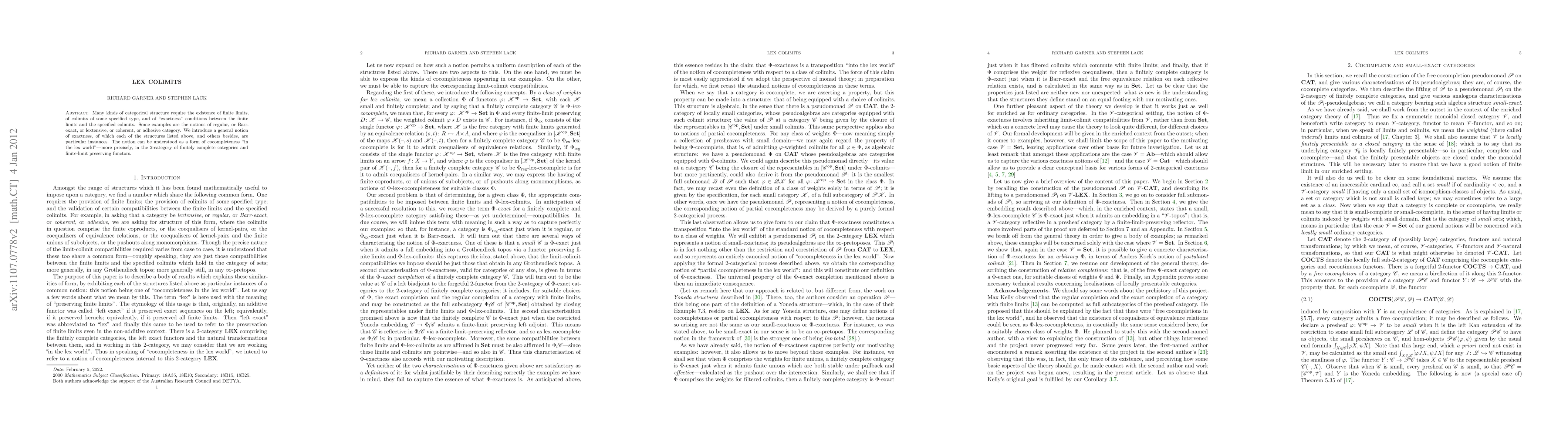 This paper introduces a generalized notion of exactness, encompassing various categorical structures like regular, Barr-exact, lextensive, coherent, and adhesive categories, as a form of cocompleteness in the 2-category of finitely complete categories and finite-limit preserving functors. This framework unifies and extends existing categorical concepts under a single "lex colimits" perspective.