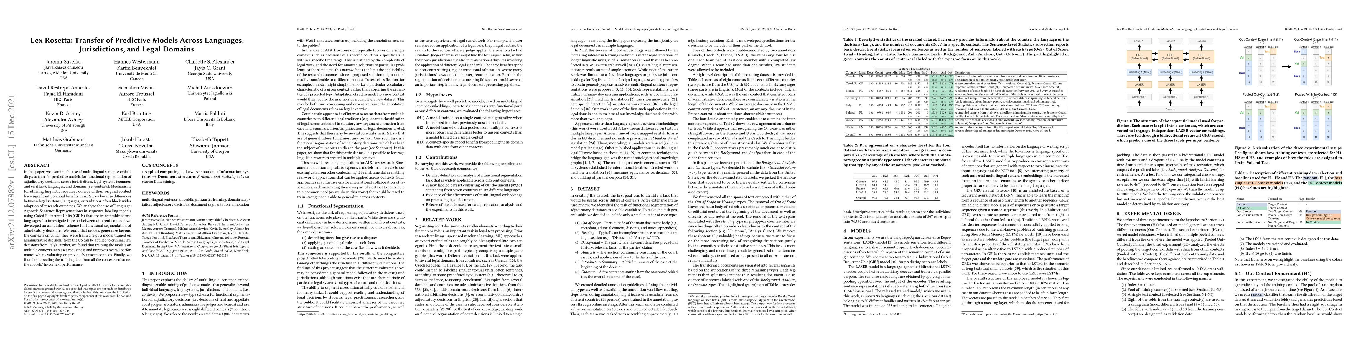 In this paper, we examine the use of multi-lingual sentence embeddings to transfer predictive models for functional segmentation of adjudicatory decisions across jurisdictions, legal systems (common and civil law), languages, and domains (i.e. contexts). Mechanisms for utilizing linguistic resources outside of their original context have significant potential benefits in AI & Law because differences between legal systems, languages, or traditions often block wider adoption of research outcomes. We analyze the use of Language-Agnostic Sentence Representations in sequence labeling models using Gated Recurrent Units (GRUs) that are transferable across languages. To investigate transfer between different contexts we developed an annotation scheme for functional segmentation of adjudicatory decisions. We found that models generalize beyond the contexts on which they were trained (e.g., a model trained on administrative decisions from the US can be applied to criminal law decisions from Italy). Further, we found that training the models on multiple contexts increases robustness and improves overall performance when evaluating on previously unseen contexts. Finally, we found that pooling the training data from all the contexts enhances the models' in-context performance.