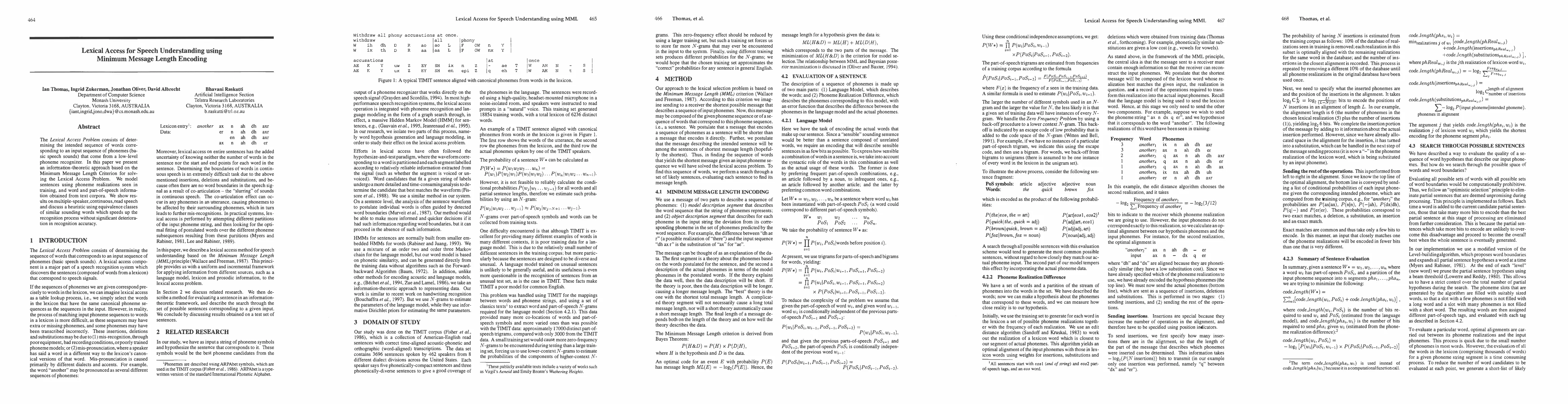This paper proposes an information-theoretic solution to the Lexical Access Problem using the Minimum Message Length Criterion, modeling sentences with training phoneme realizations and text corpora data. It introduces a heuristic based on equivalence classes of similar sounding words to accelerate recognition with minimal loss in accuracy.
