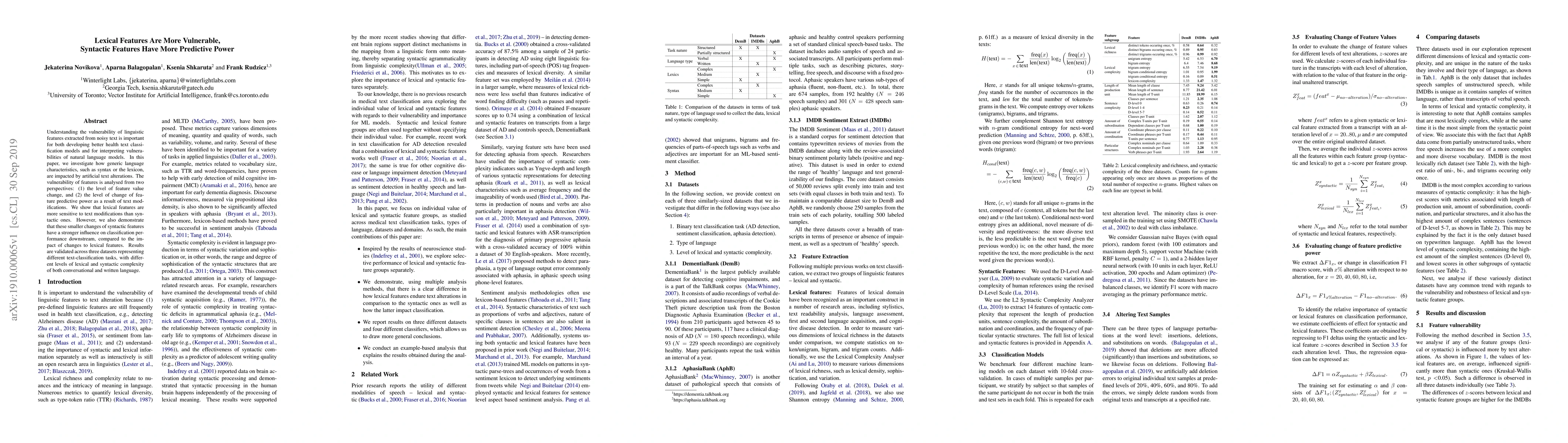 This paper investigates the vulnerability of lexical versus syntactic features in noisy text, finding that while lexical features are more sensitive to text alterations, syntactic features retain more predictive power for classification tasks. The study validates these findings across three diverse datasets, highlighting the importance of syntactic features for model performance.