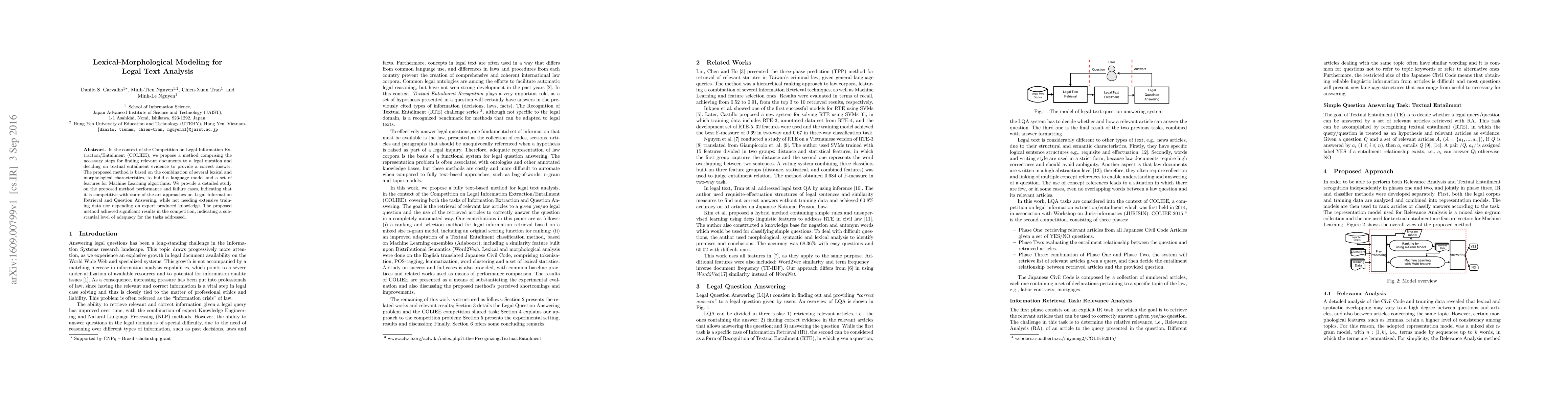 In the context of the Competition on Legal Information Extraction/Entailment (COLIEE), we propose a method comprising the necessary steps for finding relevant documents to a legal question and deciding on textual entailment evidence to provide a correct answer. The proposed method is based on the combination of several lexical and morphological characteristics, to build a language model and a set of features for Machine Learning algorithms. We provide a detailed study on the proposed method performance and failure cases, indicating that it is competitive with state-of-the-art approaches on Legal Information Retrieval and Question Answering, while not needing extensive training data nor depending on expert produced knowledge. The proposed method achieved significant results in the competition, indicating a substantial level of adequacy for the tasks addressed.