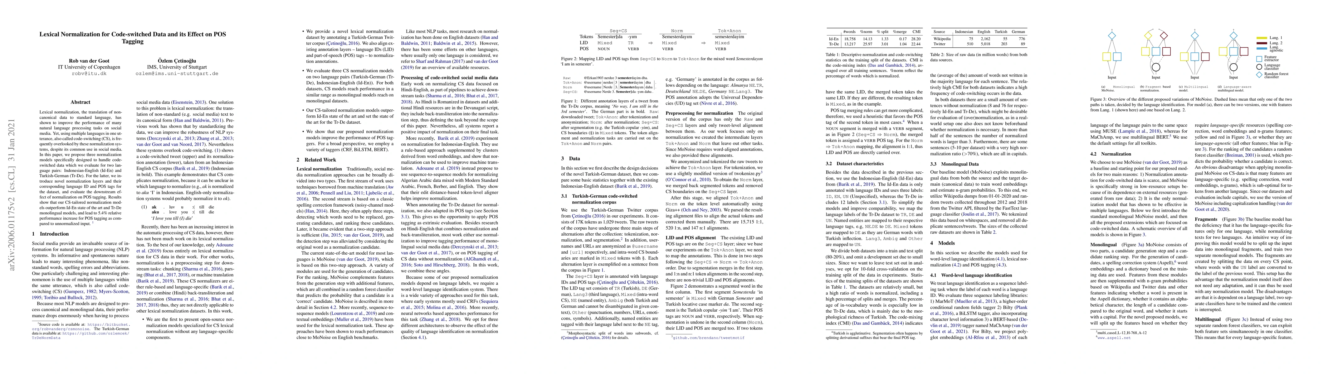 This paper proposes three lexical normalization models to handle code-switching in social media data, specifically for Indonesian-English and Turkish-German language pairs. The results demonstrate improved performance in POS tagging, with a 5.4% relative increase compared to unnormalized input.