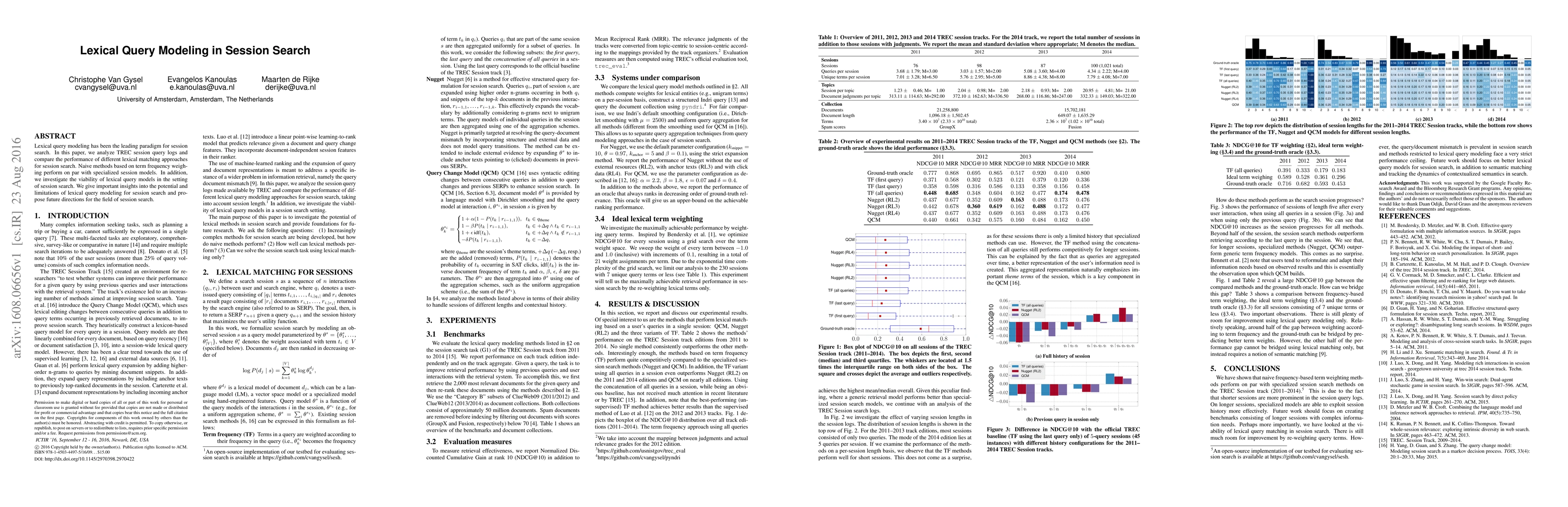 This paper analyzes TREC session query logs to compare various lexical matching approaches for session search, finding that simple term frequency methods match the performance of specialized models. It provides insights into the potential and limitations of lexical query modeling in session search, suggesting future research directions.