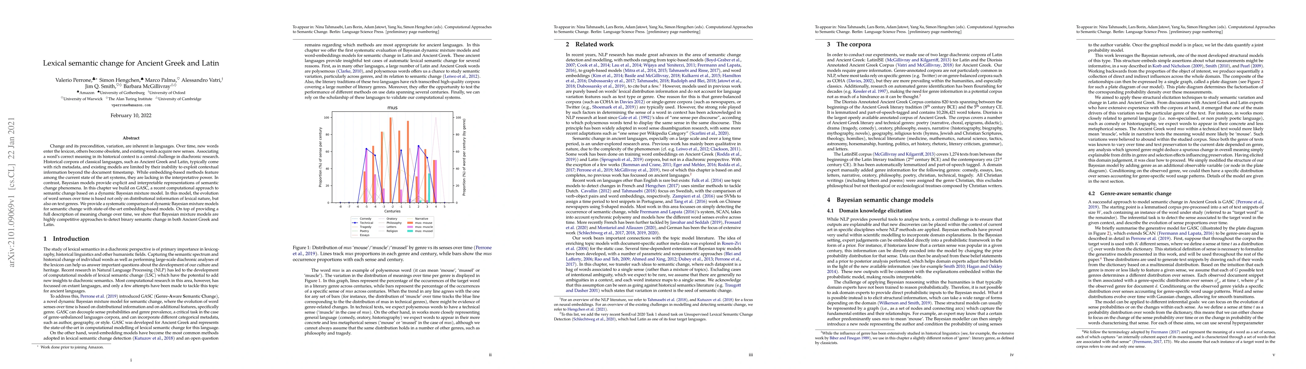Change and its precondition, variation, are inherent in languages. Over time, new words enter the lexicon, others become obsolete, and existing words acquire new senses. Associating a word's correct meaning in its historical context is a central challenge in diachronic research. Historical corpora of classical languages, such as Ancient Greek and Latin, typically come with rich metadata, and existing models are limited by their inability to exploit contextual information beyond the document timestamp. While embedding-based methods feature among the current state of the art systems, they are lacking in the interpretative power. In contrast, Bayesian models provide explicit and interpretable representations of semantic change phenomena. In this chapter we build on GASC, a recent computational approach to semantic change based on a dynamic Bayesian mixture model. In this model, the evolution of word senses over time is based not only on distributional information of lexical nature, but also on text genres. We provide a systematic comparison of dynamic Bayesian mixture models for semantic change with state-of-the-art embedding-based models. On top of providing a full description of meaning change over time, we show that Bayesian mixture models are highly competitive approaches to detect binary semantic change in both Ancient Greek and Latin.