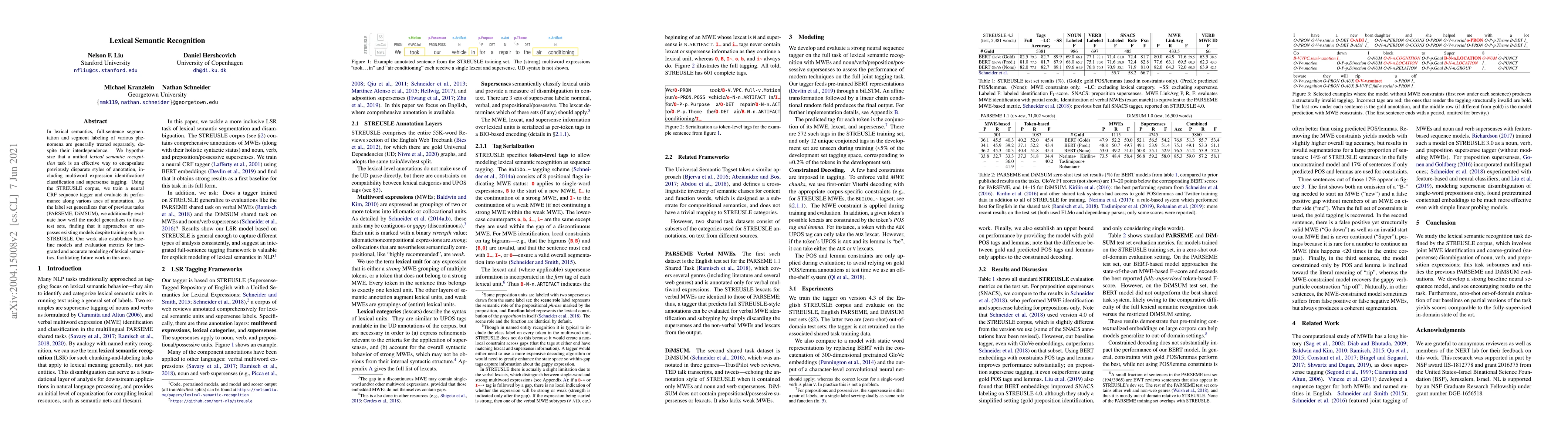 This paper proposes a unified lexical semantic recognition task to integrate multiword expression identification and supersense tagging, trained and evaluated on the STREUSLE corpus using a neural CRF sequence tagger. The model demonstrates comparable or superior performance to existing models, establishing baselines for future lexical semantics research.