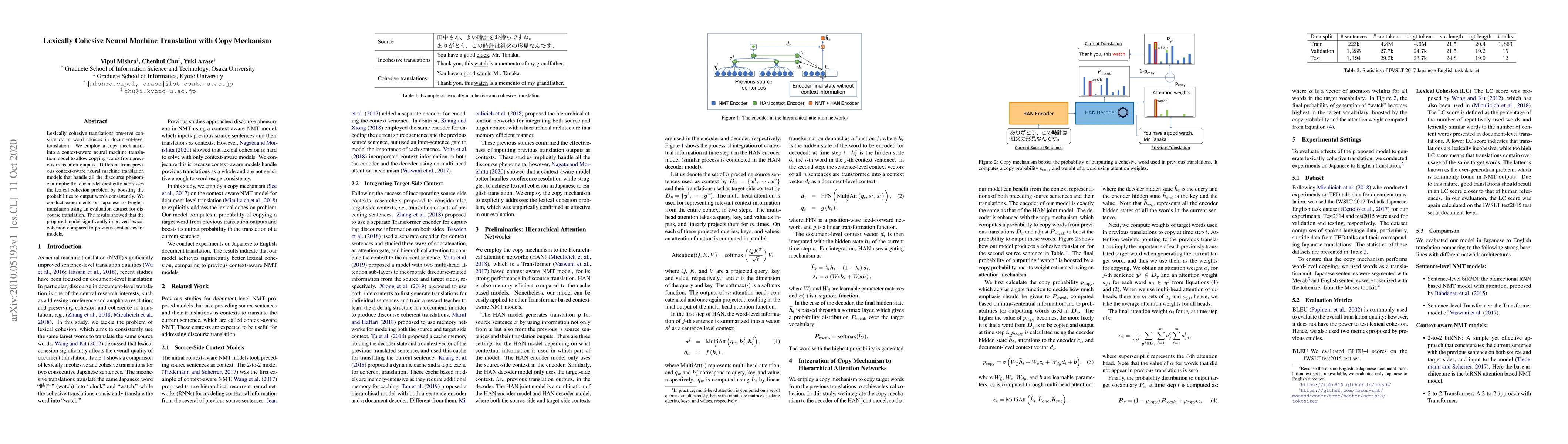 This paper proposes a neural machine translation model incorporating a copy mechanism to enhance lexical cohesion in translations, explicitly addressing consistency in word choices. Experiments on Japanese to English translation demonstrate improved lexical cohesion over traditional context-aware models.