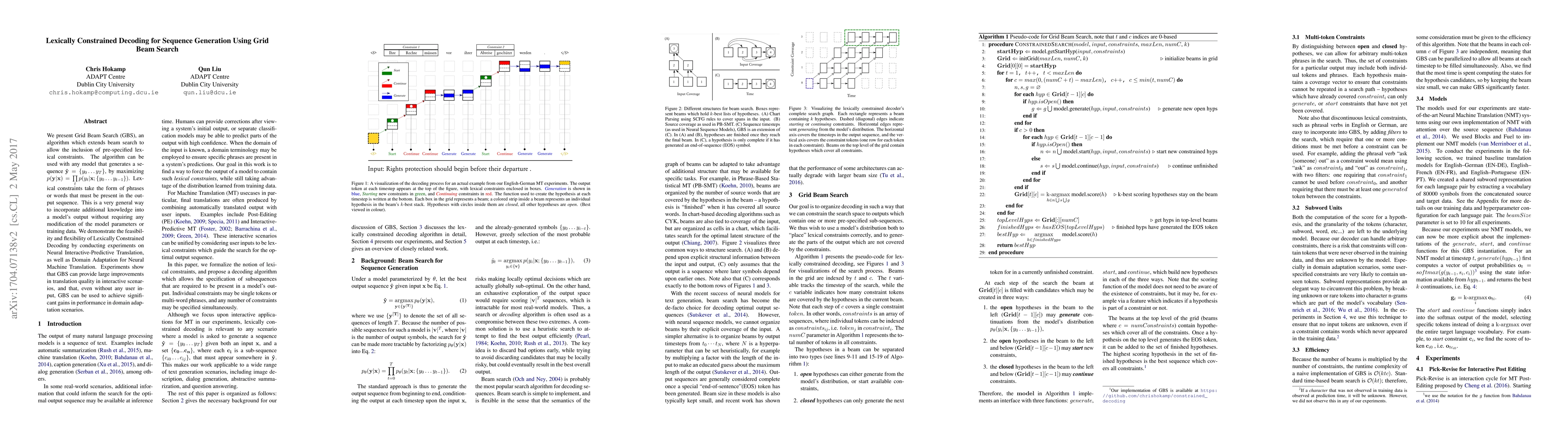 The paper introduces Grid Beam Search (GBS), an extension of beam search that incorporates lexical constraints to improve sequence generation models. GBS demonstrates significant improvements in translation quality in interactive and domain adaptation scenarios without altering model parameters or training data.