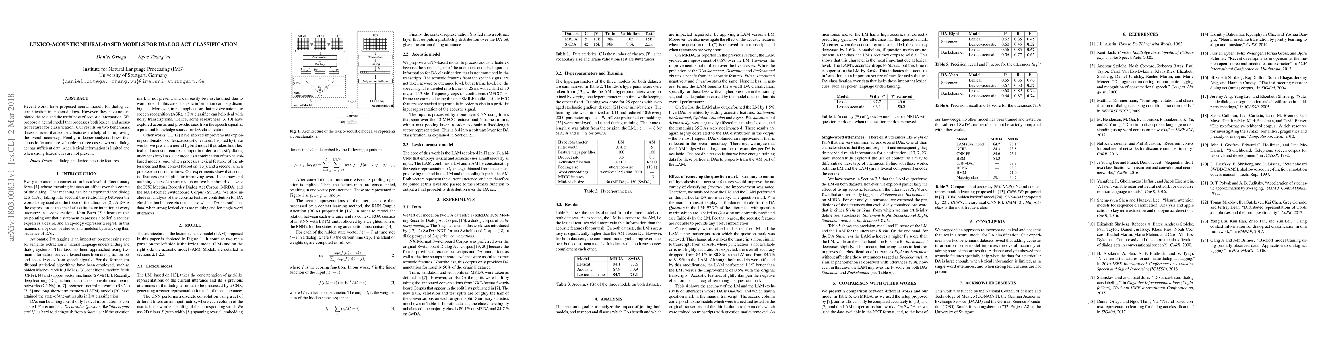 This paper proposes a neural model that integrates both lexical and acoustic features for dialog act classification in spoken dialogs, demonstrating improved accuracy. Acoustic features are particularly beneficial in scenarios with limited lexical information or when strong lexical cues are absent.