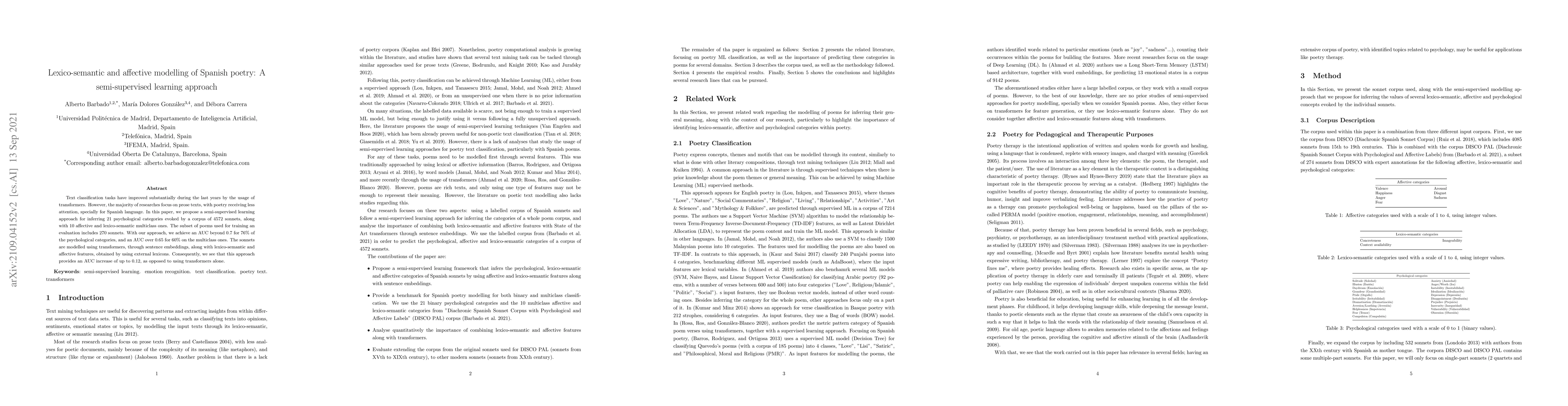 Text classification tasks have improved substantially during the last years by the usage of transformers. However, the majority of researches focus on prose texts, with poetry receiving less attention, specially for Spanish language. In this paper, we propose a semi-supervised learning approach for inferring 21 psychological categories evoked by a corpus of 4572 sonnets, along with 10 affective and lexico-semantic multiclass ones. The subset of poems used for training an evaluation includes 270 sonnets. With our approach, we achieve an AUC beyond 0.7 for 76% of the psychological categories, and an AUC over 0.65 for 60% on the multiclass ones. The sonnets are modelled using transformers, through sentence embeddings, along with lexico-semantic and affective features, obtained by using external lexicons. Consequently, we see that this approach provides an AUC increase of up to 0.12, as opposed to using transformers alone.