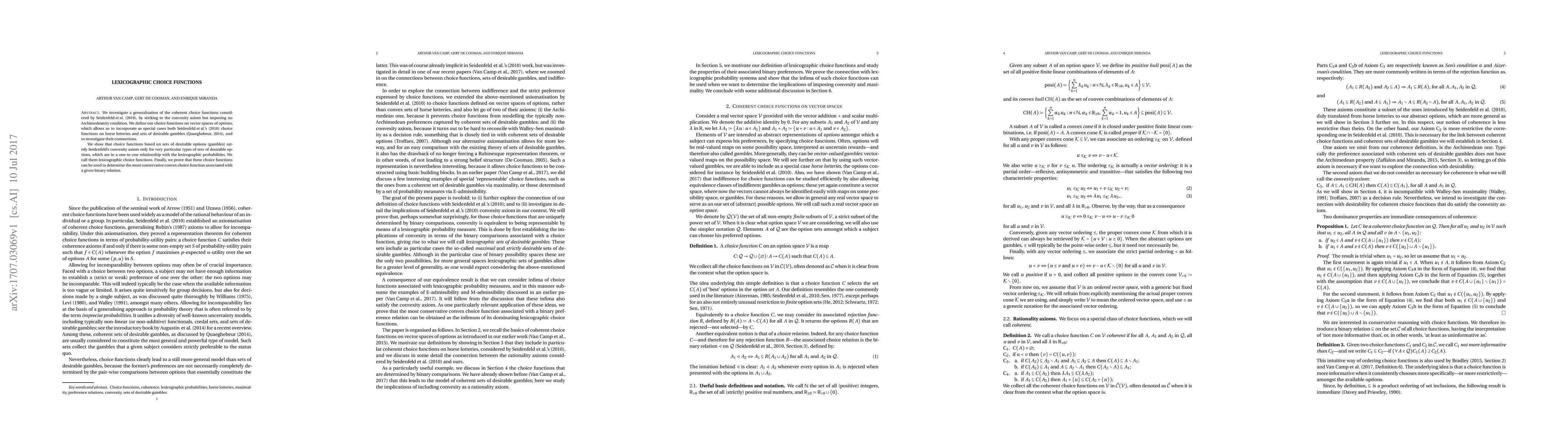 This paper generalizes coherent choice functions by defining lexicographic choice functions on vector spaces, showing they satisfy the convexity axiom only for specific sets linked to lexicographic probabilities, and proving they determine the most conservative convex choice function for a given binary relation.