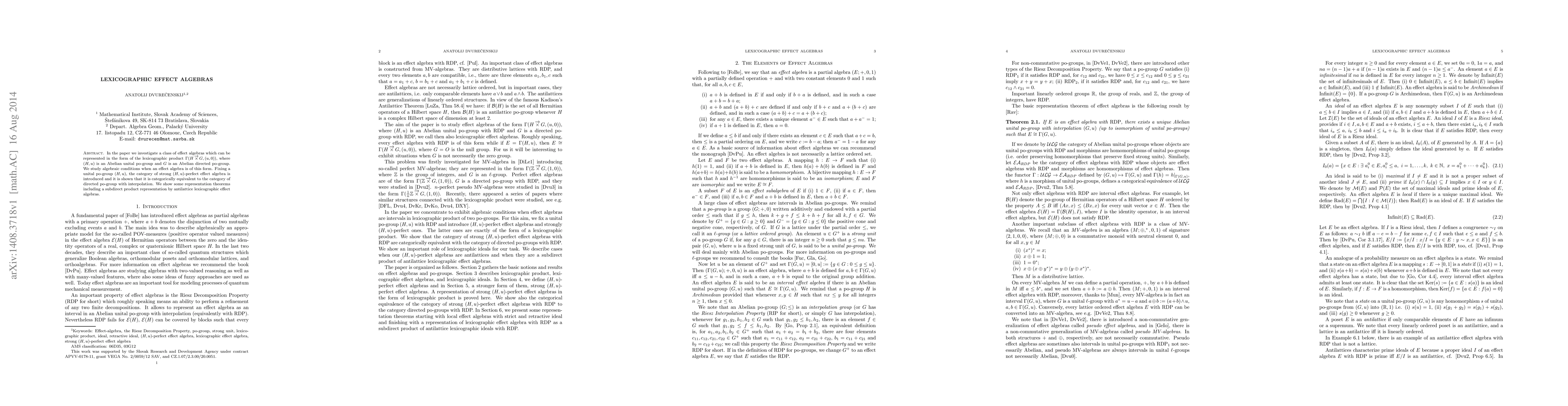 In the paper we investigate a class of effect algebras which can be represented in the form of the lexicographic product $\Gamma(H\lex G,(u,0))$, where $(H,u)$ is an Abelian unital po-group and $G$ is an Abelian directed po-group. We study algebraic conditions when an effect algebra is of this form. Fixing a unital po-group $(H,u)$, the category of strong $(H,u)$-perfect effect algebra is introduced and it is shown that it is categorically equivalent to the category of directed po-group with interpolation. We show some representation theorems including a subdirect product representation by antilattice lexicographic effect algebras.