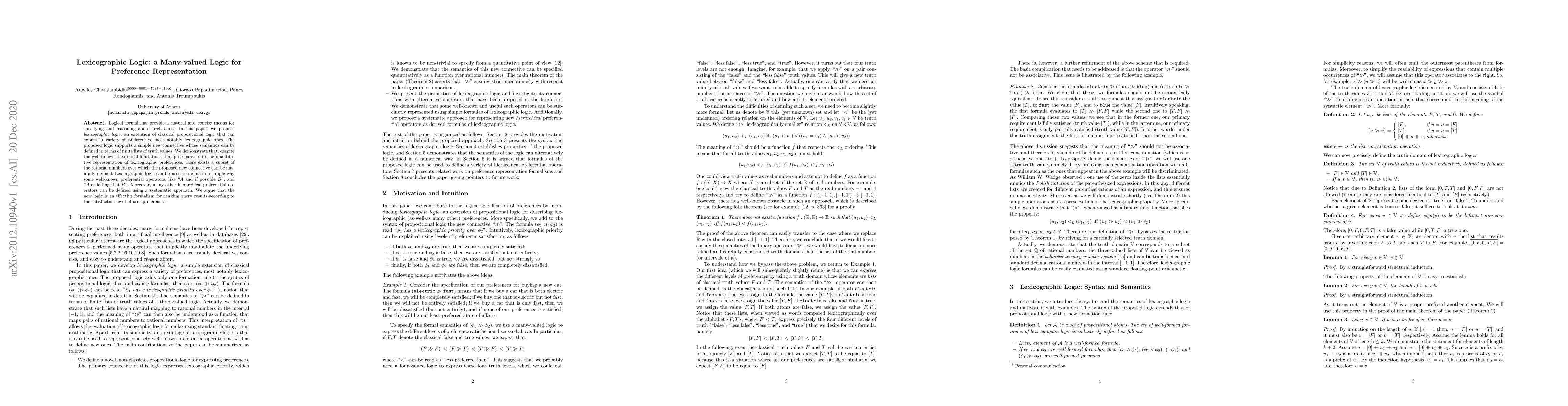 This paper introduces lexicographic logic, an extension of classical propositional logic designed to represent and reason about lexicographic preferences. It proposes a new connective that can naturally define a subset of rational numbers, enabling the representation of hierarchical preferential operators and ranking query results based on user preferences.