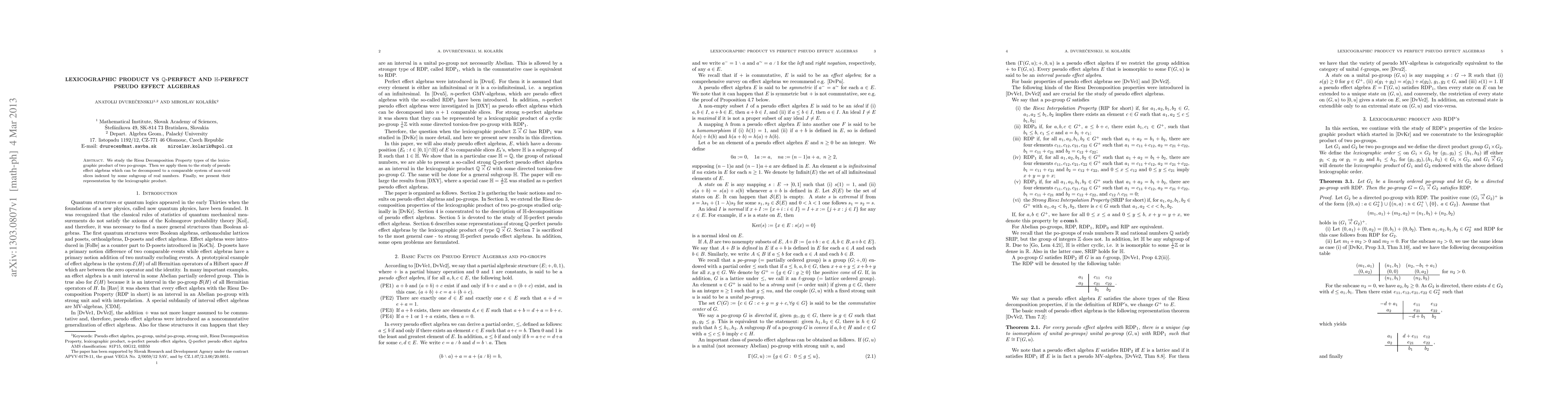 We study the Riesz Decomposition Property types of the lexicographic product of two po-groups. Then we apply them to the study of pseudo effect algebras which can be decomposed to a comparable system of non-void slices indexed by some subgroup of real numbers. Finally, we present their representation by the lexicographic product.