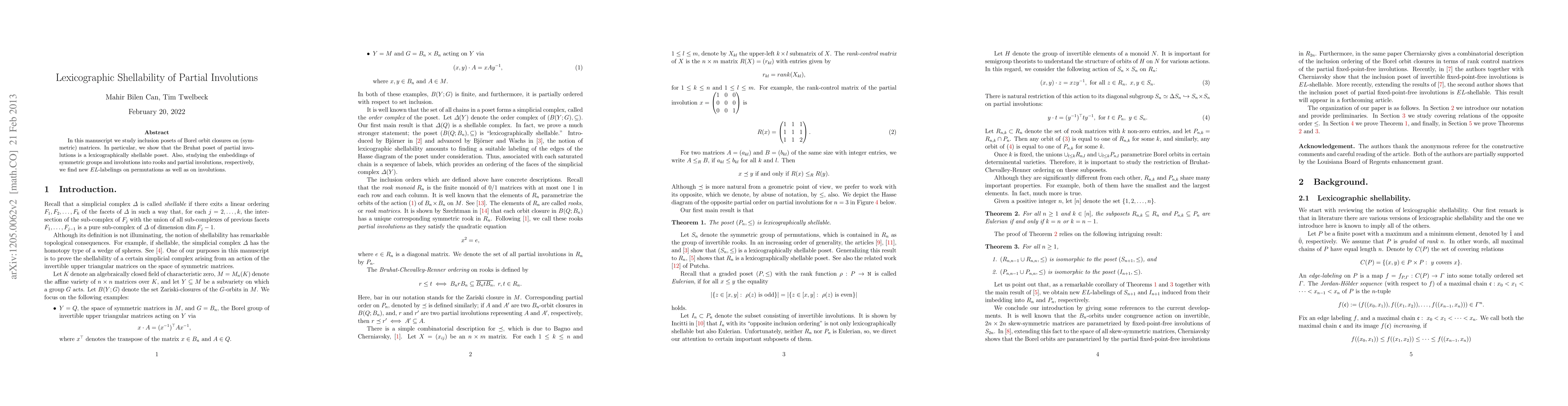 In this manuscript we study inclusion posets of Borel orbit closures on (symmetric) matrices. In particular, we show that the Bruhat poset of partial involutions is a lexicographiically shellable poset. Also, studying the embeddings of symmetric groups and involutions into rooks and partial involutions, respectively, we find new $EL$-labelings on permutations as well as on involutions.