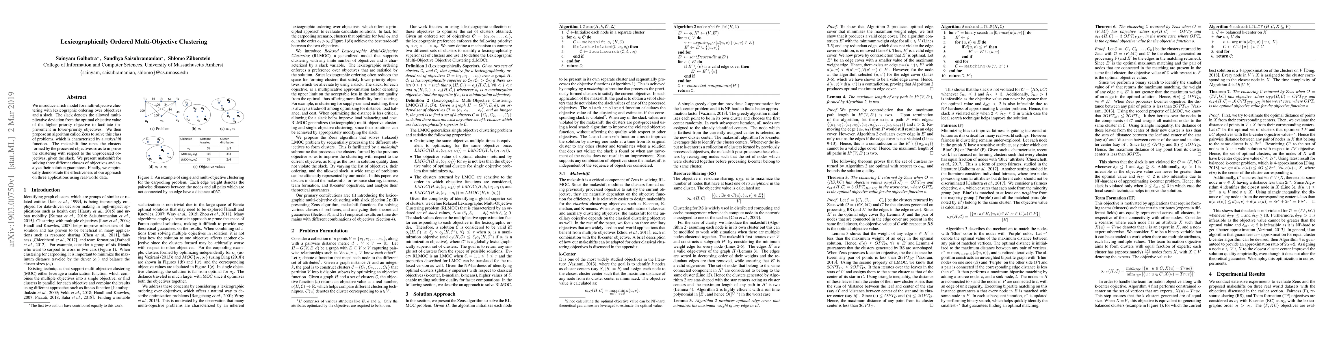 We introduce a rich model for multi-objective clustering with lexicographic ordering over objectives and a slack. The slack denotes the allowed multiplicative deviation from the optimal objective value of the higher priority objective to facilitate improvement in lower-priority objectives. We then propose an algorithm called Zeus to solve this class of problems, which is characterized by a makeshift function. The makeshift fine tunes the clusters formed by the processed objectives so as to improve the clustering with respect to the unprocessed objectives, given the slack. We present makeshift for solving three different classes of objectives and analyze their solution guarantees. Finally, we empirically demonstrate the effectiveness of our approach on three applications using real-world data.