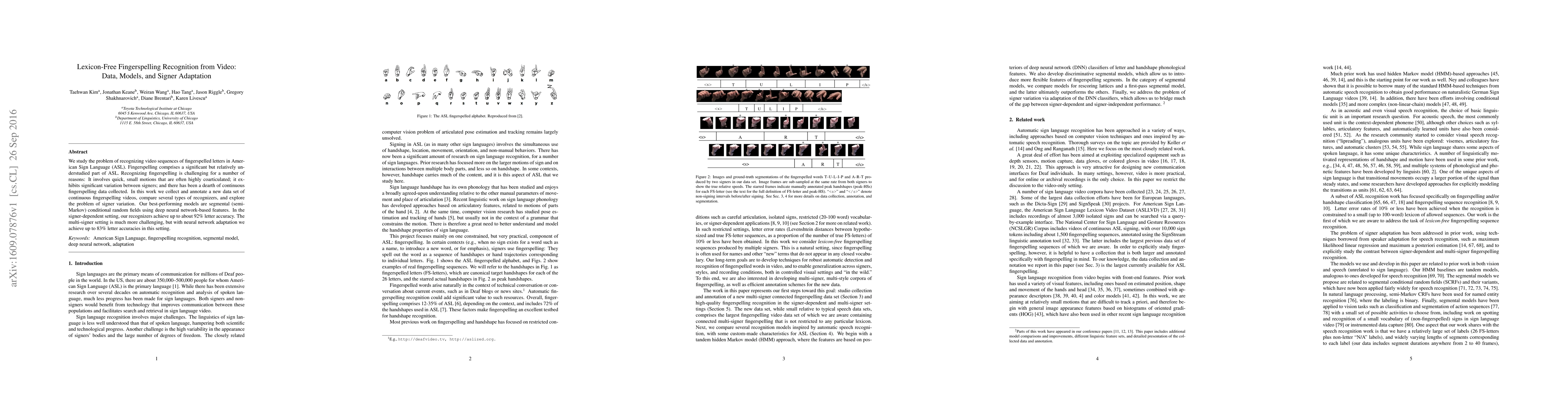 This research presents a lexicon-free fingerspelling recognition system for American Sign Language (ASL) based on video data, introducing a new dataset and employing deep neural network features in segmental models to achieve up to 92% accuracy for signer-dependent settings and 83% for multi-signer scenarios using neural adaptation techniques.