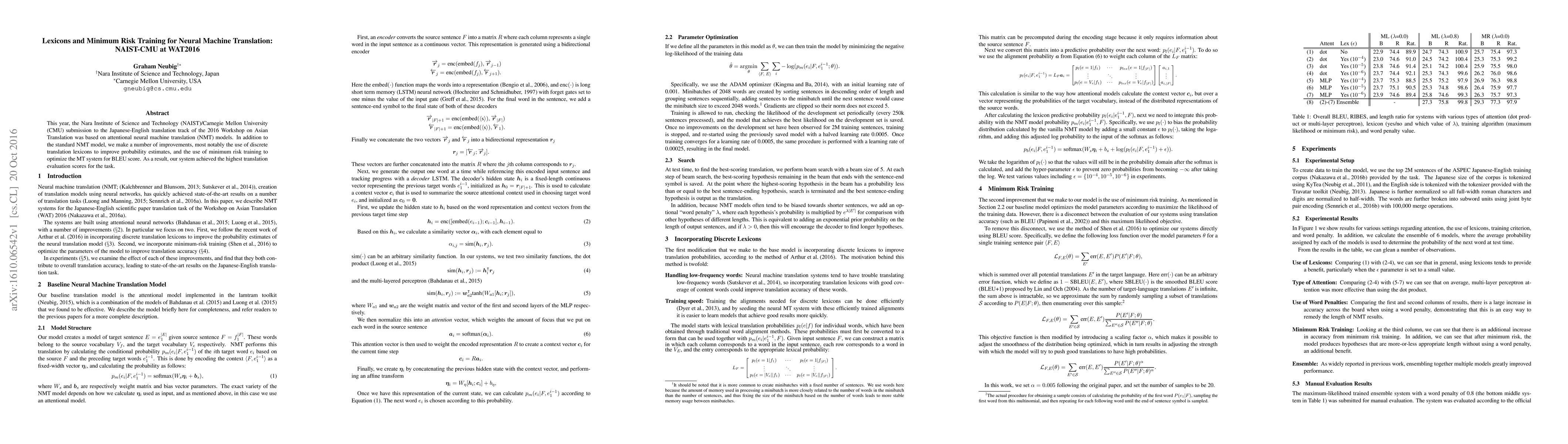 This year, the Nara Institute of Science and Technology (NAIST)/Carnegie Mellon University (CMU) submission to the Japanese-English translation track of the 2016 Workshop on Asian Translation was based on attentional neural machine translation (NMT) models. In addition to the standard NMT model, we make a number of improvements, most notably the use of discrete translation lexicons to improve probability estimates, and the use of minimum risk training to optimize the MT system for BLEU score. As a result, our system achieved the highest translation evaluation scores for the task.