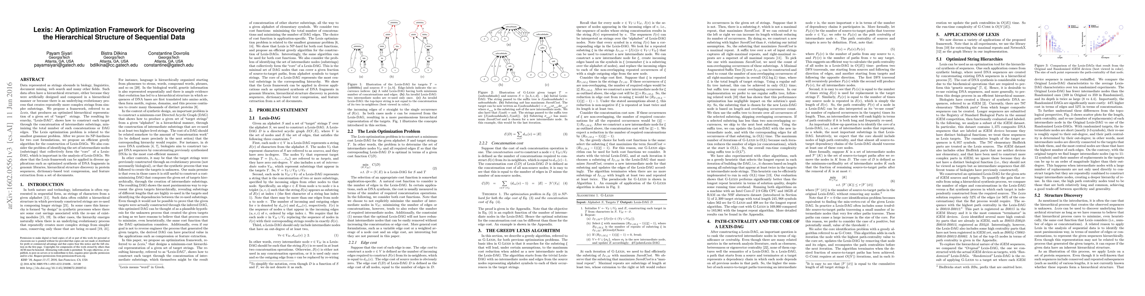 The Lexis framework optimizes the hierarchical structure of sequential data by generating a directed acyclic graph (Lexis-DAG) that minimizes concatenations. Despite its NP-Hardness, an efficient greedy algorithm is proposed, and its applications span genomic libraries, protein sequences, text compression, and document feature extraction.