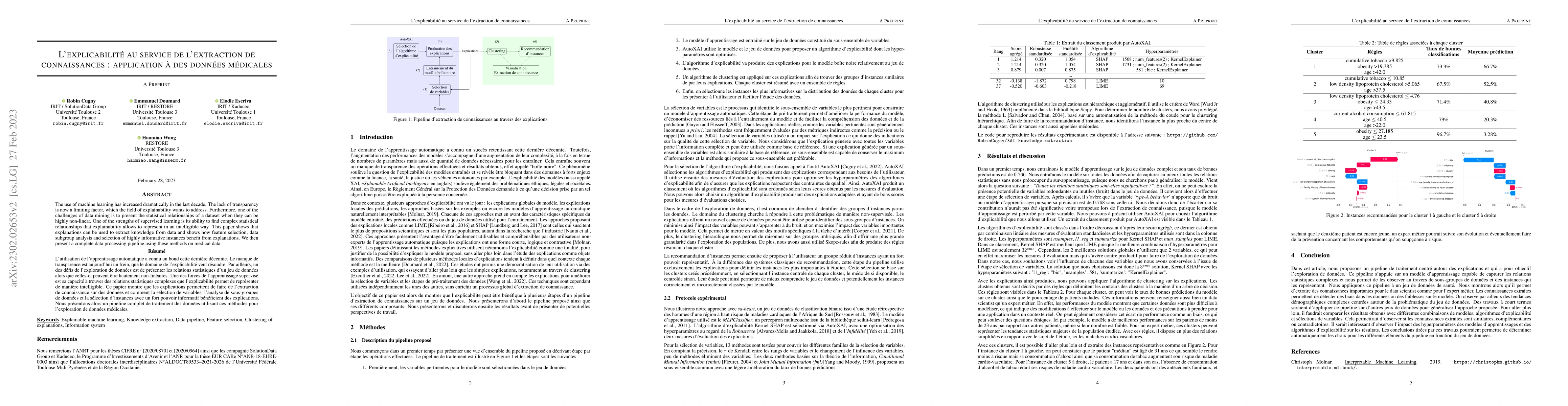 The use of machine learning has increased dramatically in the last decade. The lack of transparency is now a limiting factor, which the field of explainability wants to address. Furthermore, one of the challenges of data mining is to present the statistical relationships of a dataset when they can be highly non-linear. One of the strengths of supervised learning is its ability to find complex statistical relationships that explainability allows to represent in an intelligible way. This paper shows that explanations can be used to extract knowledge from data and shows how feature selection, data subgroup analysis and selection of highly informative instances benefit from explanations. We then present a complete data processing pipeline using these methods on medical data. -- -- L'utilisation de l'apprentissage automatique a connu un bond cette derni\`ere d\'ecennie. Le manque de transparence est aujourd'hui un frein, que le domaine de l'explicabilit\'e veut r\'esoudre. Par ailleurs, un des d\'efis de l'exploration de donn\'ees est de pr\'esenter les relations statistiques d'un jeu de donn\'ees alors que celles-ci peuvent \^etre hautement non-lin\'eaires. Une des forces de l'apprentissage supervis\'e est sa capacit\'e \`a trouver des relations statistiques complexes que l'explicabilit\'e permet de repr\'esenter de mani\`ere intelligible. Ce papier montre que les explications permettent de faire de l'extraction de connaissance sur des donn\'ees et comment la s\'election de variables, l'analyse de sous-groupes de donn\'ees et la s\'election d'instances avec un fort pouvoir informatif b\'en\'eficient des explications. Nous pr\'esentons alors un pipeline complet de traitement des donn\'ees utilisant ces m\'ethodes pour l'exploration de donn\'ees m\'edicales.