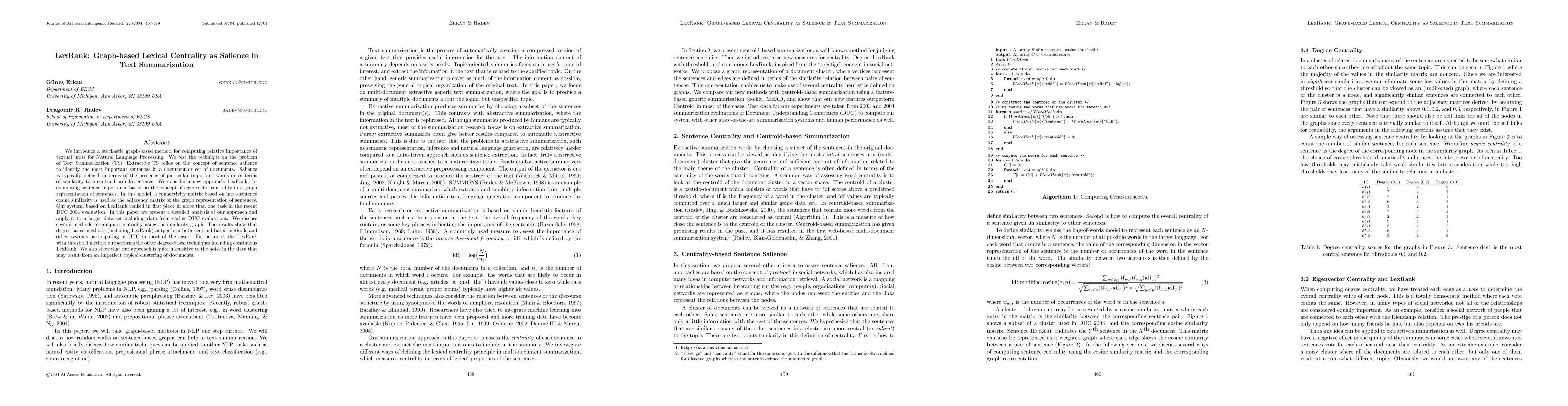 We introduce a stochastic graph-based method for computing relative importance of textual units for Natural Language Processing. We test the technique on the problem of Text Summarization (TS). Extractive TS relies on the concept of sentence salience to identify the most important sentences in a document or set of documents. Salience is typically defined in terms of the presence of particular important words or in terms of similarity to a centroid pseudo-sentence. We consider a new approach, LexRank, for computing sentence importance based on the concept of eigenvector centrality in a graph representation of sentences. In this model, a connectivity matrix based on intra-sentence cosine similarity is used as the adjacency matrix of the graph representation of sentences. Our system, based on LexRank ranked in first place in more than one task in the recent DUC 2004 evaluation. In this paper we present a detailed analysis of our approach and apply it to a larger data set including data from earlier DUC evaluations. We discuss several methods to compute centrality using the similarity graph. The results show that degree-based methods (including LexRank) outperform both centroid-based methods and other systems participating in DUC in most of the cases. Furthermore, the LexRank with threshold method outperforms the other degree-based techniques including continuous LexRank. We also show that our approach is quite insensitive to the noise in the data that may result from an imperfect topical clustering of documents.