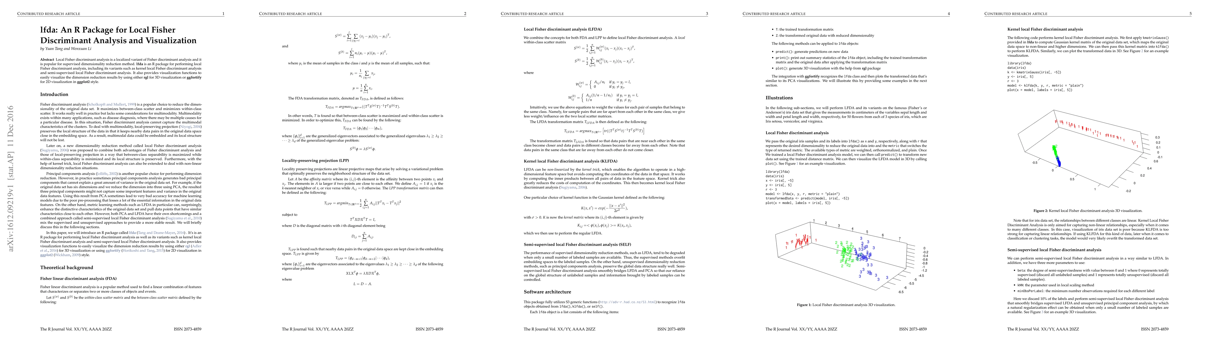 Summary: The lfda R package facilitates local Fisher discriminant analysis, including kernel and semi-supervised variants, and offers visualization tools for 2D and 3D results using ggfortify and rgl.