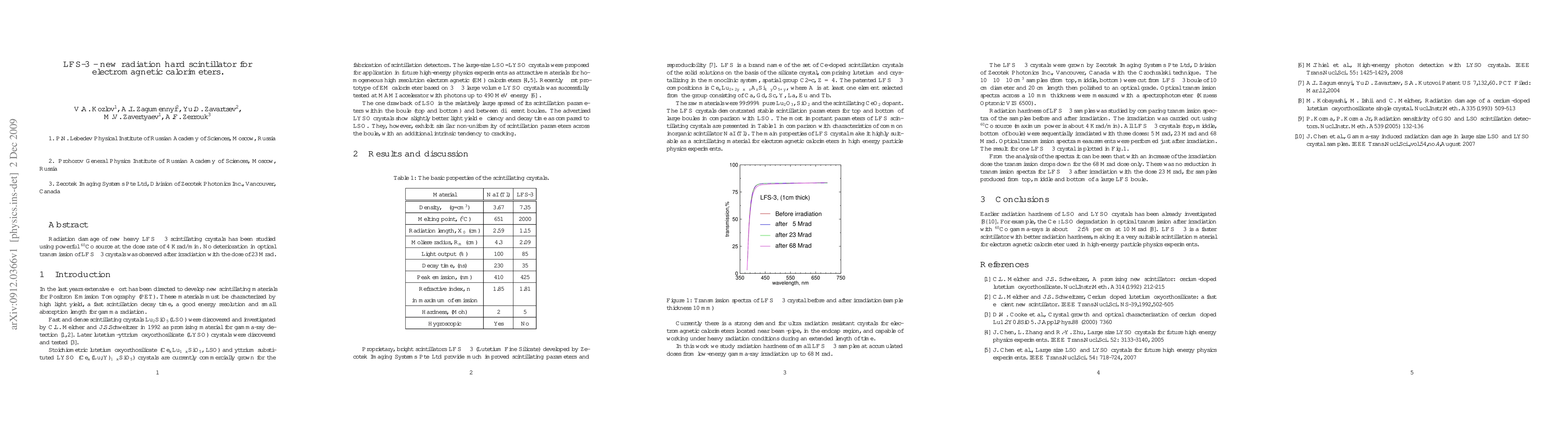 Radiation damage of new heavy LFS-3 scintillating crystals has been studied using powerful $^{60}Co$ source at the dose rate of 4 Krad/min. No deterioration in optical transmission of LFS-3 crystals was observed after irradiation with the dose of 23 Mrad.