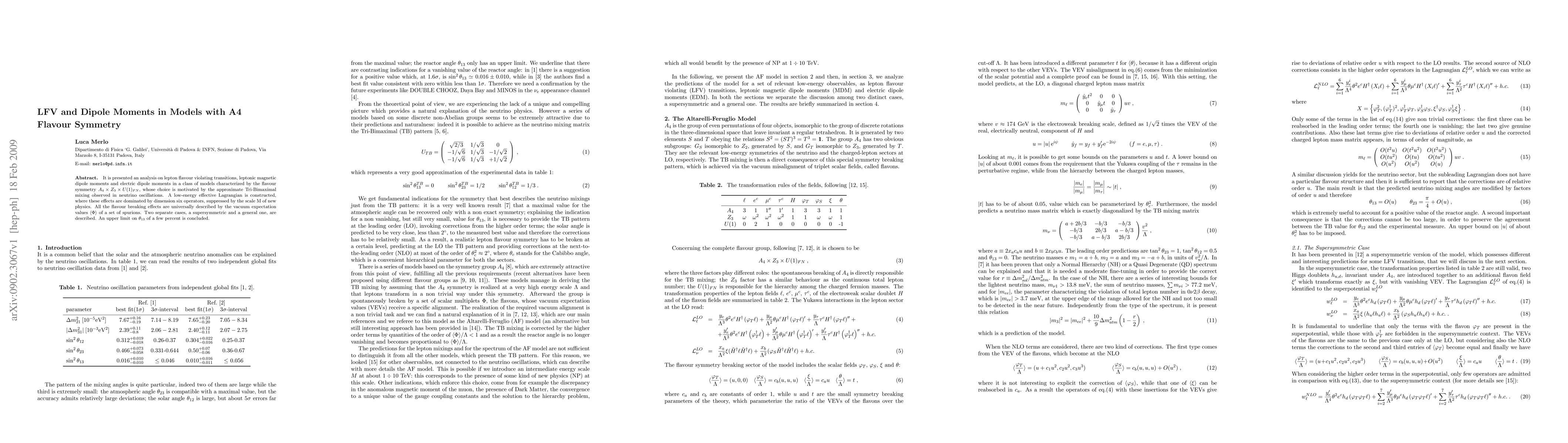 This paper analyzes lepton flavour violating transitions and dipole moments in A4 x Z3 x U(1)_FN symmetry models, motivated by Tri-Bimaximal neutrino mixing. The study constructs a low-energy effective Lagrangian with dimension six operators, and finds an upper limit on the reactor angle of a few percent, with both supersymmetric and general cases considered.