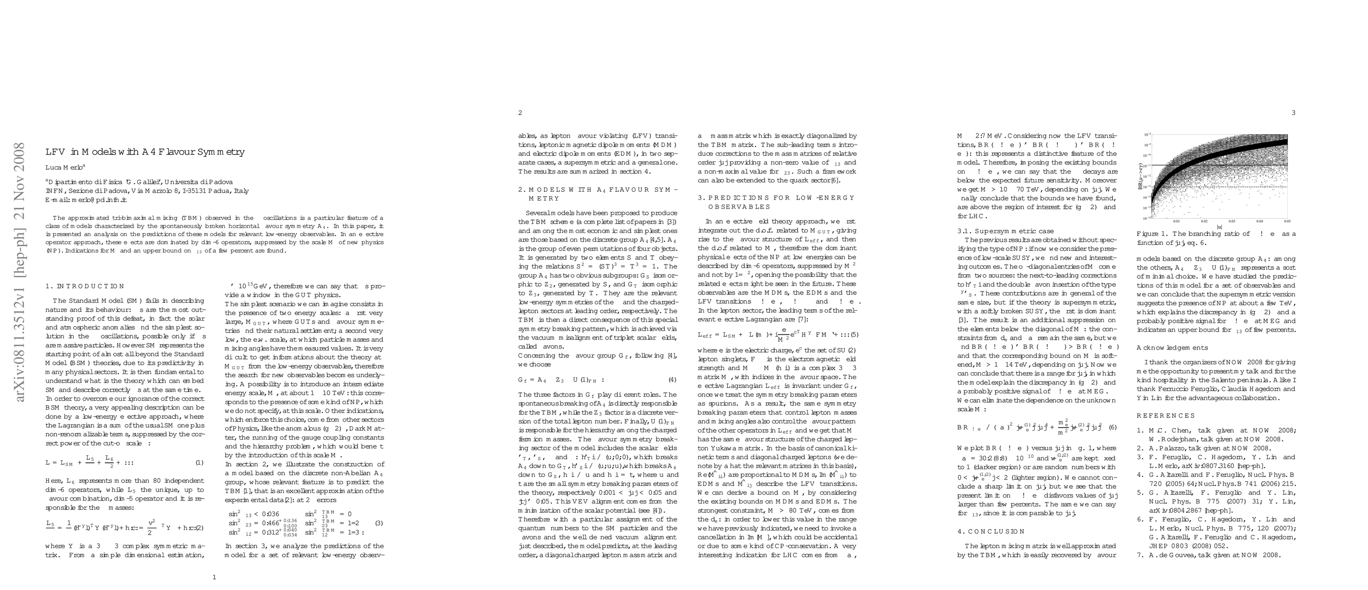 The approximated tri-bimaximal mixing observed in the neutrino oscillations is a particular feature of a class of models characterized by the spontaneously broken horizontal flavour symmetry A4. In this paper, it is presented an analysis on the predictions of these models for relevant low-energy observables. In an effective operator approach, these effects are dominated by dim-6 operators, suppressed by the scale M of new physics. Indications for M and an upper bound on \theta_{13} of a few percent are found.
