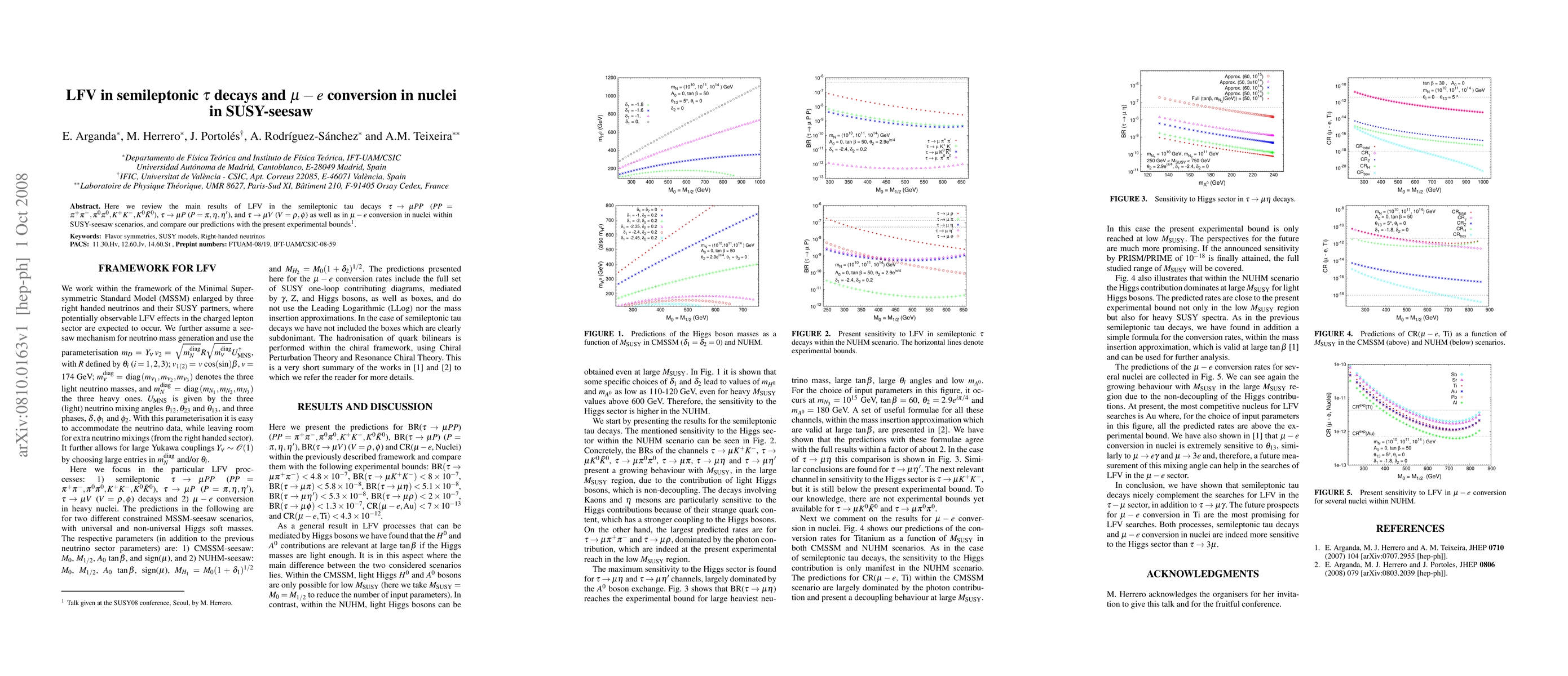 Here we review the main results of LFV in the semileptonic tau decays $\tau \to \mu PP$ ($PP = \pi^+ \pi^-, \pi^0 \pi^0, K^+ K^-, K^0 \bar{K}^0$), $\tau \to \mu P$ ($P = \pi, \eta, \eta^{\prime}$), and $\tau \to \mu V$ ($V = \rho, \phi$) as well as in $\mu-e$ conversion in nuclei within SUSY-seesaw scenarios, and compare our predictions with the present experimental bounds