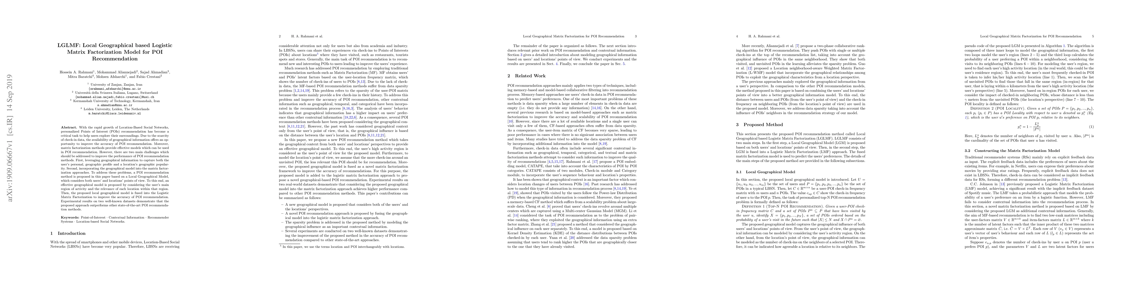 This paper proposes a Local Geographical based Logistic Matrix Factorization Model (LGLMF) for POI recommendation, addressing the challenges of leveraging geographical information and integrating it into matrix factorization. The method outperforms other state-of-the-art techniques, as demonstrated by experiments on two datasets.