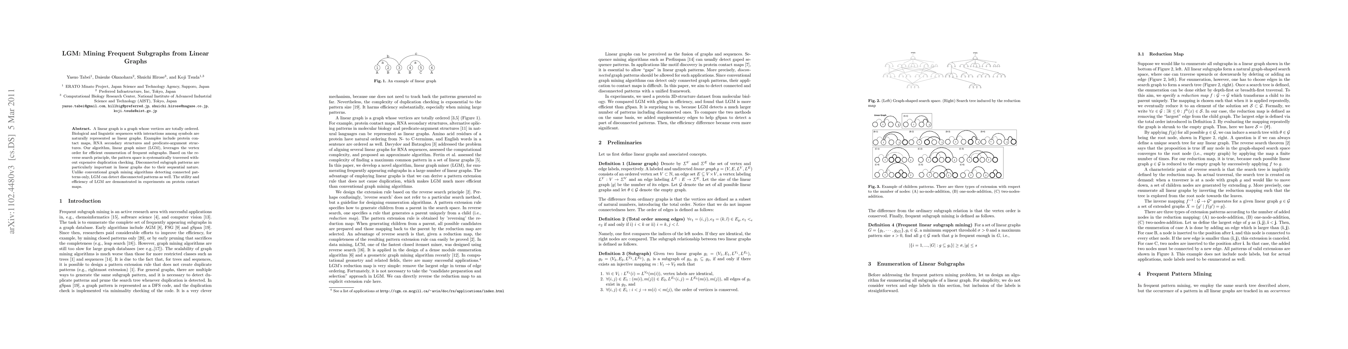 A linear graph is a graph whose vertices are totally ordered. Biological and linguistic sequences with interactions among symbols are naturally represented as linear graphs. Examples include protein contact maps, RNA secondary structures and predicate-argument structures. Our algorithm, linear graph miner (LGM), leverages the vertex order for efficient enumeration of frequent subgraphs. Based on the reverse search principle, the pattern space is systematically traversed without expensive duplication checking. Disconnected subgraph patterns are particularly important in linear graphs due to their sequential nature. Unlike conventional graph mining algorithms detecting connected patterns only, LGM can detect disconnected patterns as well. The utility and efficiency of LGM are demonstrated in experiments on protein contact maps.