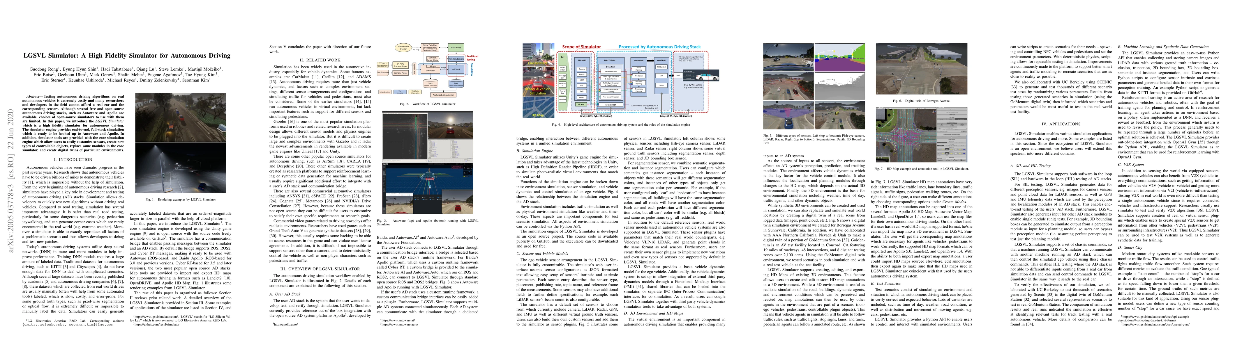 The LGSVL Simulator is a high fidelity autonomous driving simulator offering full-stack simulation for testing algorithms with Autoware and Apollo. It provides customizable tools for sensor modification, object creation, and environment replication.