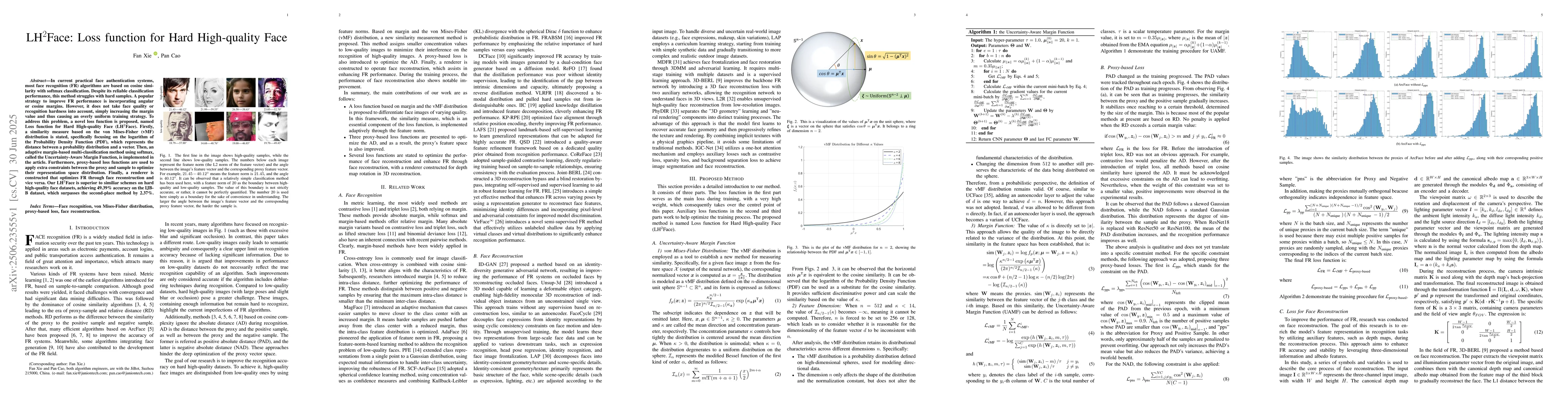 In current practical face authentication systems, most face recognition (FR) algorithms are based on cosine similarity with softmax classification. Despite its reliable classification performance, this method struggles with hard samples. A popular strategy to improve FR performance is incorporating angular or cosine margins. However, it does not take face quality or recognition hardness into account, simply increasing the margin value and thus causing an overly uniform training strategy. To address this problem, a novel loss function is proposed, named Loss function for Hard High-quality Face (LH2Face). Firstly, a similarity measure based on the von Mises-Fisher (vMF) distribution is stated, specifically focusing on the logarithm of the Probability Density Function (PDF), which represents the distance between a probability distribution and a vector. Then, an adaptive margin-based multi-classification method using softmax, called the Uncertainty-Aware Margin Function, is implemented in the article. Furthermore, proxy-based loss functions are used to apply extra constraints between the proxy and sample to optimize their representation space distribution. Finally, a renderer is constructed that optimizes FR through face reconstruction and vice versa. Our LH2Face is superior to similiar schemes on hard high-quality face datasets, achieving 49.39% accuracy on the IJB-B dataset, which surpasses the second-place method by 2.37%.