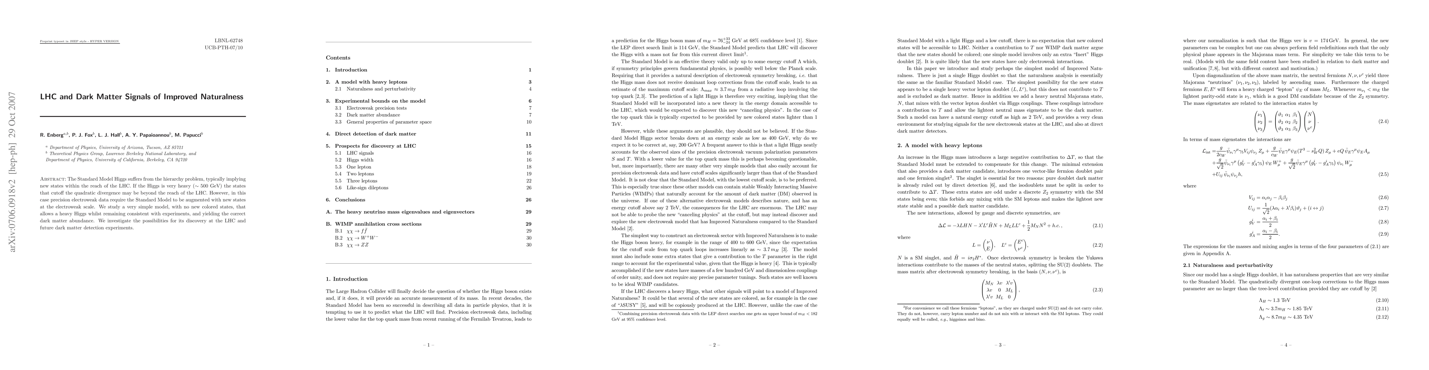 The Standard Model Higgs suffers from the hierarchy problem, typically implying new states within the reach of the LHC. If the Higgs is very heavy (~500 GeV) the states that cutoff the quadratic divergence may be beyond the reach of the LHC. However, in this case precision electroweak data require the Standard Model to be augmented with new states at the electroweak scale. We study a very simple model, with no new colored states, that allows a heavy Higgs whilst remaining consistent with experiments, and yielding the correct dark matter abundance. We investigate the possibilities for its discovery at the LHC and future dark matter detection experiments.