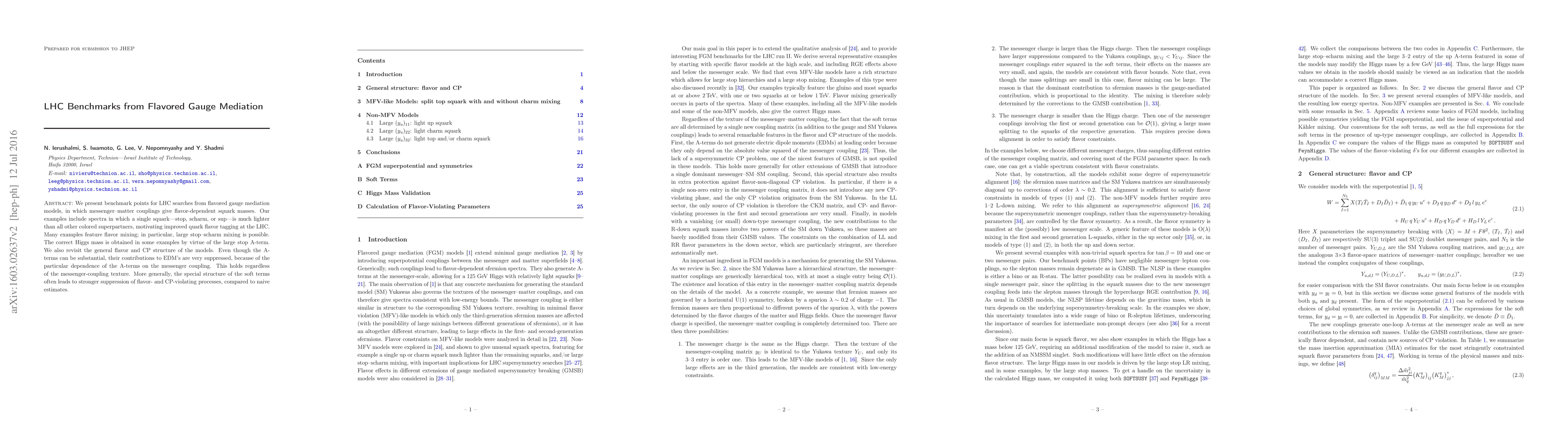 This paper provides benchmark points for LHC searches in flavored gauge mediation models, where messenger-matter couplings lead to distinct squark masses. It highlights scenarios with a significantly lighter squark, such as the stop, scharm, or sup, and discusses the implications for quark flavor tagging and the suppression of flavor- and CP-violating processes.