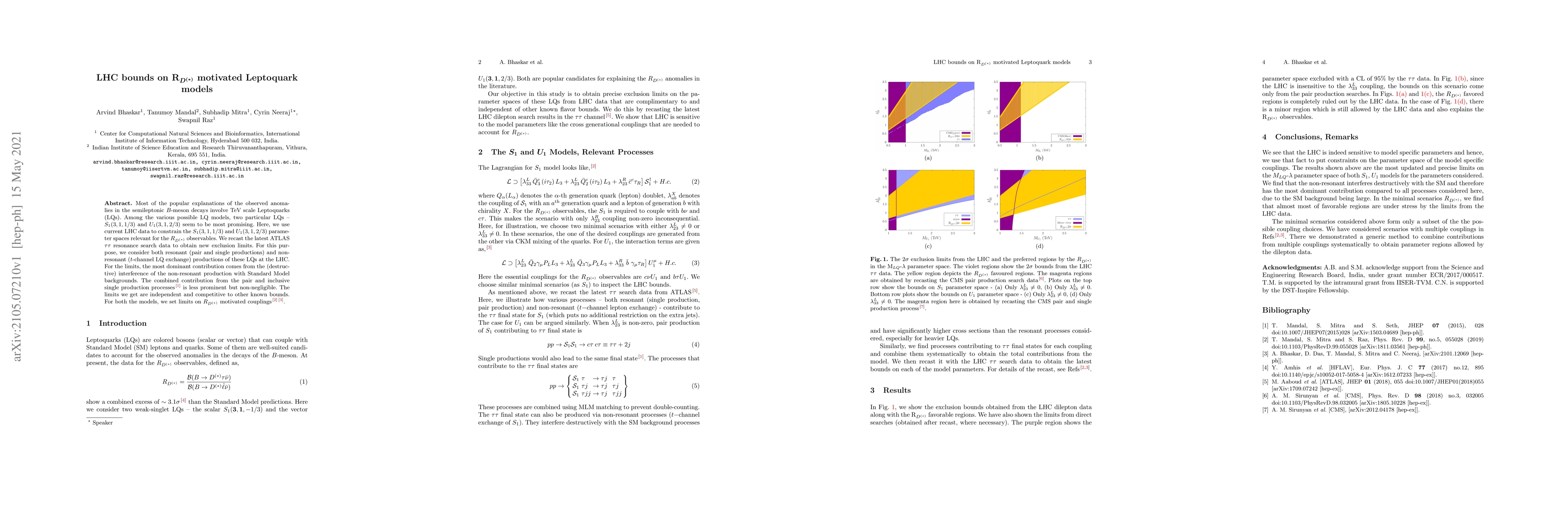 Most of the popular explanations of the observed anomalies in the semileptonic $B$-meson decays involve TeV scale Leptoquarks (LQs). Among the various possible LQ models, two particular LQs -- $S_{1}(3, 1, 1/3)$ and $U_{1}(3, 1, 2/3)$ seem to be most promising. Here, we use current LHC data to constrain the $S_{1}(3, 1, 1/3)$ and $U_{1}(3, 1, 2/3)$ parameter spaces relevant for the $R_{D^{(*)}}$ observables. We recast the latest ATLAS $\tau\tau$ resonance search data to obtain new exclusion limits. For this purpose, we consider both resonant (pair and single productions) and non-resonant ($t$-channel LQ exchange) productions of these LQs at the LHC. For the limits, the most dominant contribution comes from the (destructive) interference of the non-resonant production with Standard Model backgrounds. The combined contribution from the pair and inclusive single production processes is less prominent but non-negligible. The limits we get are independent and competitive to other known bounds. For both the models, we set limits on $R_{D^{(*)}}$ motivated couplings.