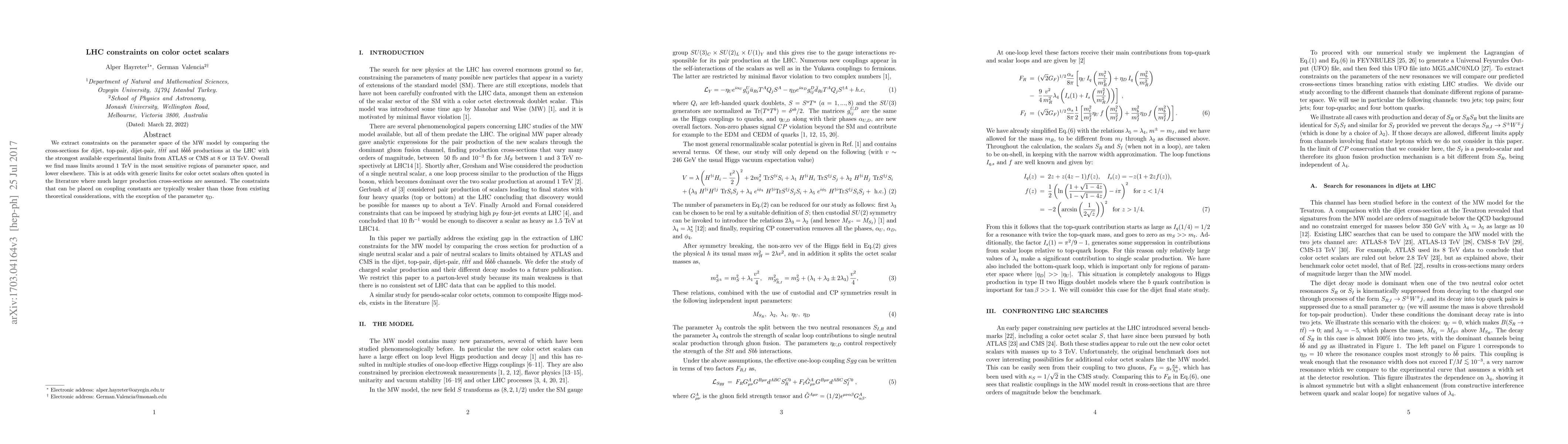 We extract constraints on the parameter space of the MW model by comparing the cross-sections for dijet, top-pair, dijet-pair, $t\bar t t \bar t$ and $b\bar b b \bar b$ productions at the LHC with the strongest available experimental limits from ATLAS or CMS at 8 or 13 TeV. Overall we find that masses below 1 TeV have not been excluded for color octet scalars as it is often claimed in the literature. The constraints that can be placed on coupling constants are typically weaker than those from existing theoretical considerations, with the exception of the parameter $\eta_D$.
