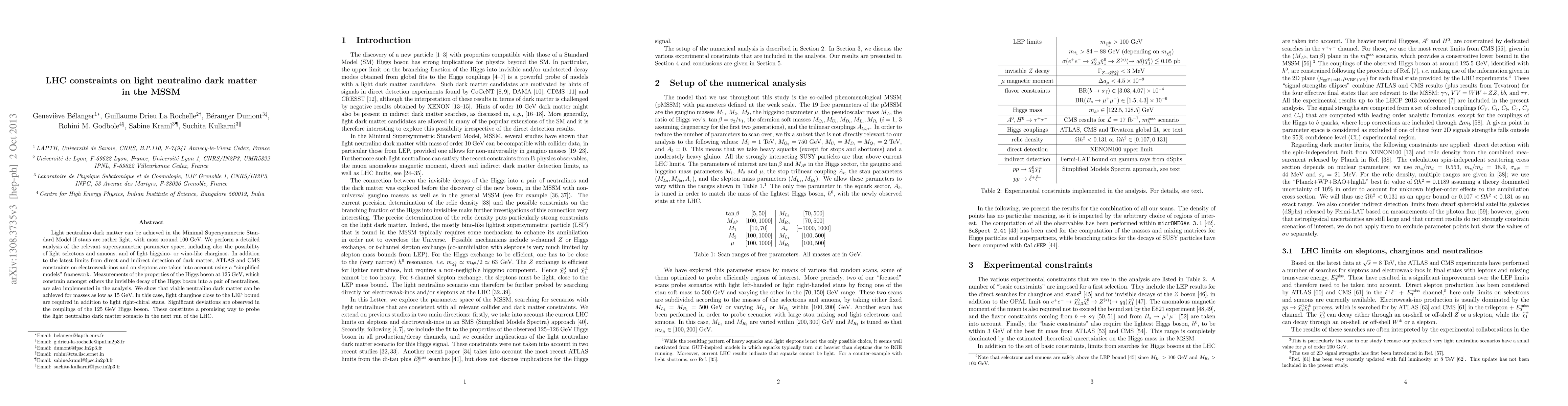 Light neutralino dark matter can be achieved in the Minimal Supersymmetric Standard Model if staus are rather light, with mass around 100 GeV. We perform a detailed analysis of the relevant supersymmetric parameter space, including also the possibility of light selectons and smuons, and of light higgsino- or wino-like charginos. In addition to the latest limits from direct and indirect detection of dark matter, ATLAS and CMS constraints on electroweak-inos and on sleptons are taken into account using a "simplified models" framework. Measurements of the properties of the Higgs boson at 125 GeV, which constrain amongst others the invisible decay of the Higgs boson into a pair of neutralinos, are also implemented in the analysis. We show that viable neutralino dark matter can be achieved for masses as low as 15 GeV. In this case, light charginos close to the LEP bound are required in addition to light right-chiral staus. Significant deviations are observed in the couplings of the 125 GeV Higgs boson. These constitute a promising way to probe the light neutralino dark matter scenario in the next run of the LHC.