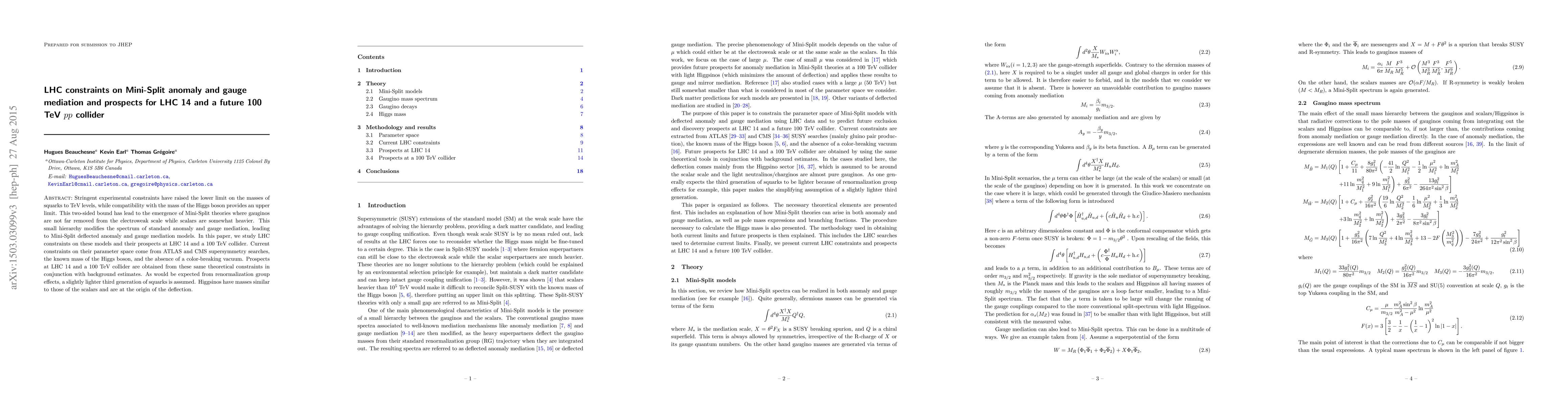 Stringent experimental constraints have raised the lower limit on the masses of squarks to TeV levels, while compatibility with the mass of the Higgs boson provides an upper limit. This two-sided bound has lead to the emergence of Mini-Split theories where gauginos are not far removed from the electroweak scale while scalars are somewhat heavier. This small hierarchy modifies the spectrum of standard anomaly and gauge mediation, leading to Mini-Split deflected anomaly and gauge mediation models. In this paper, we study LHC constraints on these models and their prospects at LHC 14 and a 100 TeV collider. Current constraints on their parameter space come from ATLAS and CMS supersymmetry searches, the known mass of the Higgs boson, and the absence of a color-breaking vacuum. Prospects at LHC 14 and a 100 TeV collider are obtained from these same theoretical constraints in conjunction with background estimates. As would be expected from renormalization group effects, a slightly lighter third generation of squarks is assumed. Higgsinos have masses similar to those of the scalars and are at the origin of the deflection.
