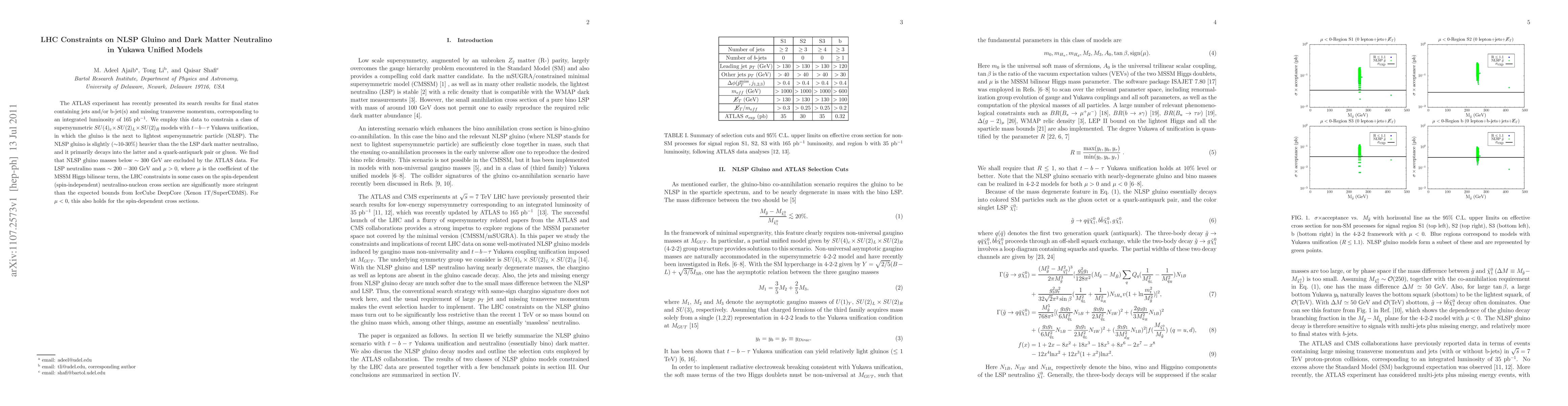 The ATLAS experiment has recently presented its search results for final states containing jets and/or b-jet(s) and missing transverse momentum, corresponding to an integrated luminosity of 165 pb^{-1}. We employ this data to constrain a class of supersymmetric SU(4)_c X SU(2)_L X SU(2)_R models with t-b-\tau Yukawa unification, in which the gluino is the next to lightest supersymmetric particle (NLSP). The NLSP gluino is slightly (~10-30%) heavier than the the LSP dark matter neutralino, and it primarily decays into the latter and a quark-antiquark pair or gluon. We find that NLSP gluino masses below ~300 GeV are excluded by the ATLAS data. For LSP neutralino mass ~200-300 GeV and \mu>0, where \mu is the coefficient of the MSSM Higgs bilinear term, the LHC constraints in some cases on the spin-dependent (spin-independent) neutralino-nucleon cross section are significantly more stringent than the expected bounds from IceCube DeepCore (Xenon 1T/SuperCDMS). For \mu<0, this also holds for the spin-dependent cross sections.