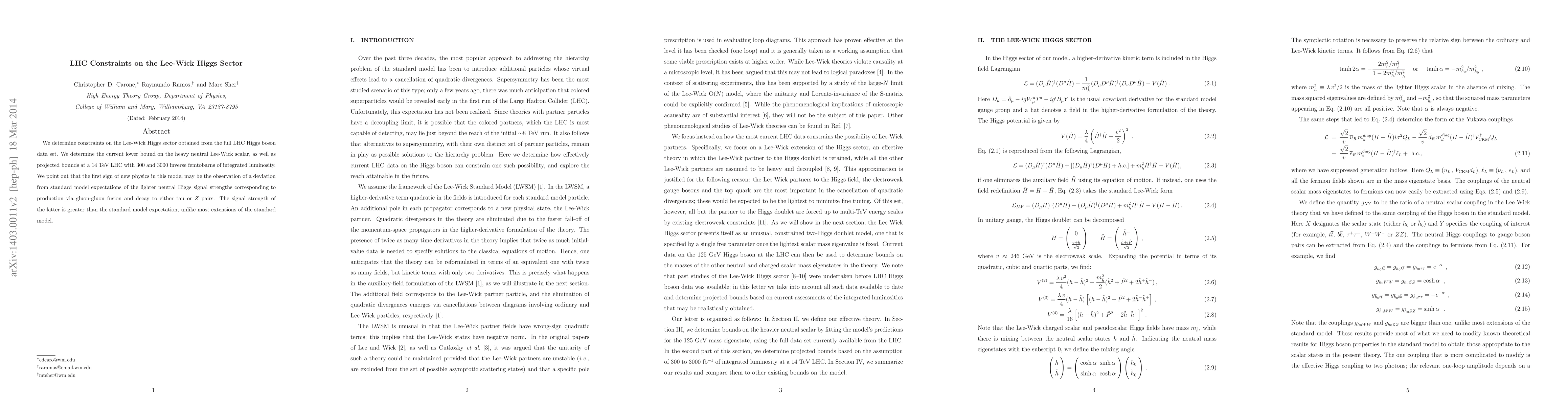 We determine constraints on the Lee-Wick Higgs sector obtained from the full LHC Higgs boson data set. We determine the current lower bound on the heavy neutral Lee-Wick scalar, as well as projected bounds at a 14 TeV LHC with 300 and 3000 inverse femtobarns of integrated luminosity. We point out that the first sign of new physics in this model may be the observation of a deviation from standard model expectations of the lighter neutral Higgs signal strengths corresponding to production via gluon-gluon fusion and decay to either tau or $Z$ pairs. The signal strength of the latter is greater than the standard model expectation, unlike most extensions of the standard model.