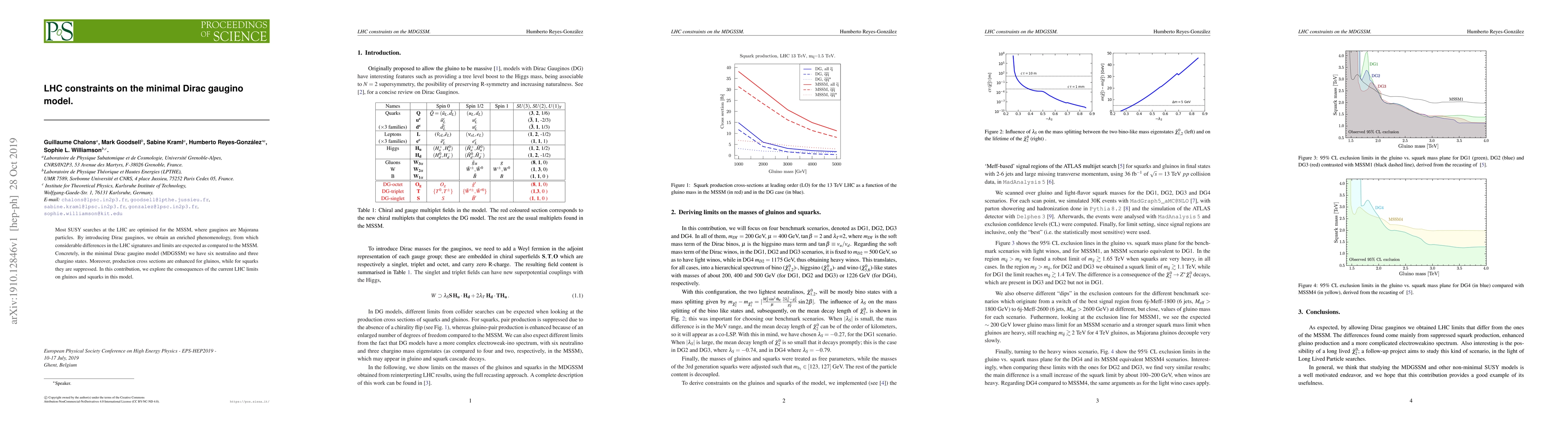 Most SUSY searches at the LHC are optimised for the MSSM, where gauginos are Majorana particles. By introducing Dirac gauginos, we obtain an enriched phenomenology, from which considerable differences in the LHC signatures and limits are expected as compared to the MSSM. Concretely, in the minimal Dirac gaugino model (MDGSSM) we have six neutralino and three chargino states. Moreover, production cross sections are enhanced for gluinos, while for squarks they are suppressed. In this contribution, we explore the consequences of the current LHC limits on gluinos and squarks in this model.