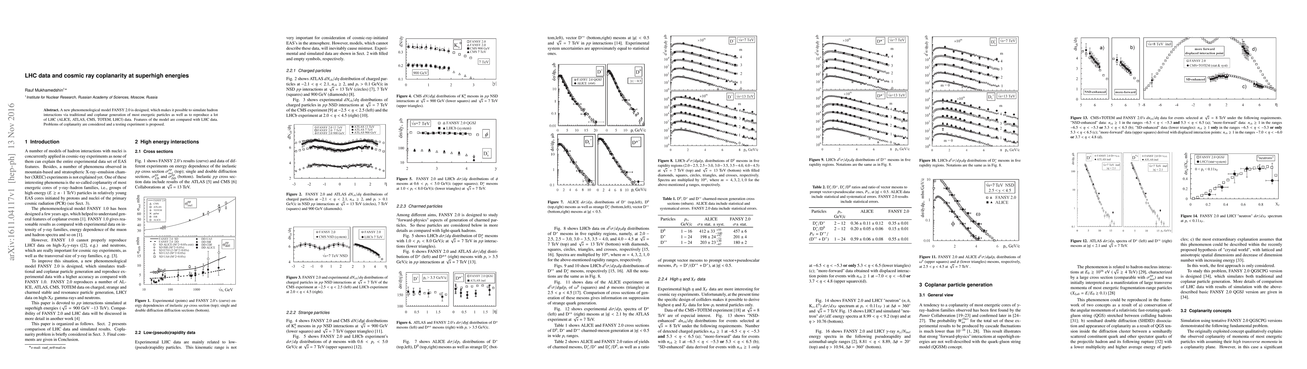 A new phenomenological model FANSY 2.0 is designed, which makes it possible to simulate hadron interactions via traditional QGSM-type particle generation as well as coplanar generation of most energetic particles, observed in cosmic ray experiments. FANSY 2.0 reproduces a lot of LHC (ALICE, ATLAS, CMS, TOTEM, LHCf) data. Results of model simulations are compared with LHC data. Problems of coplanarity are considered and a testing experiment is proposed.
