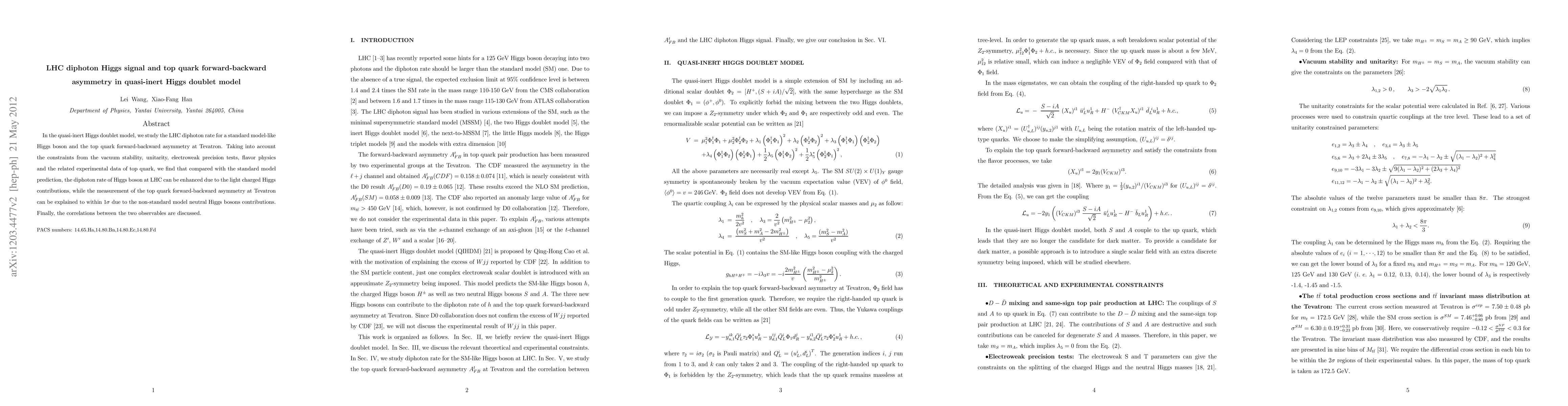 This paper investigates the quasi-inert Higgs doublet model's impact on LHC diphoton Higgs signals and Tevatron's top quark forward-backward asymmetry, finding enhanced diphoton rates due to light charged Higgs contributions and asymmetry explained by non-standard neutral Higgs bosons. Correlations between these two observables are also discussed.