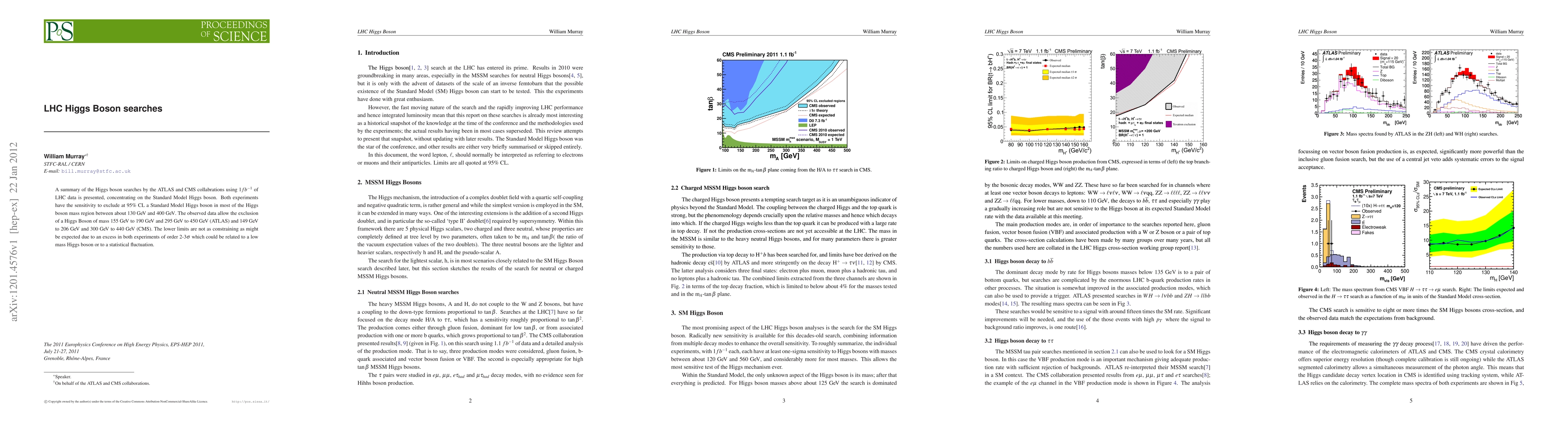 This paper summarizes Higgs boson searches by ATLAS and CMS at the LHC using 1 fb-1 of data, focusing on the Standard Model Higgs. Both experiments exclude a Higgs boson in the mass range of 155-190 GeV and 295-450 GeV, with lower limits less stringent due to a 2-3σ excess possibly hinting at a low-mass Higgs or statistical fluctuation.