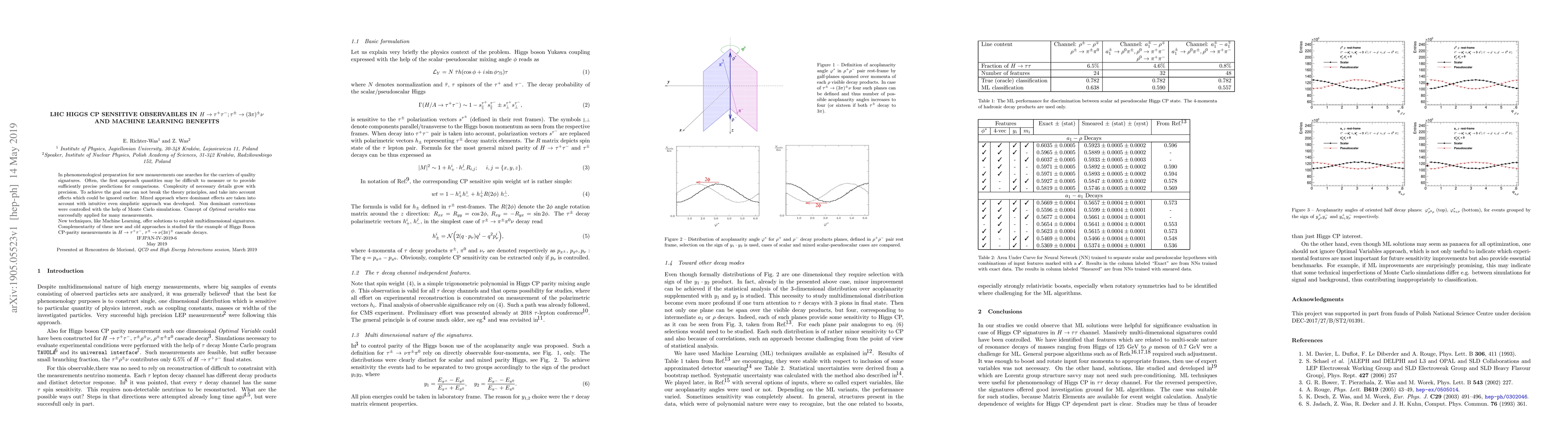 In phenomenological preparation for new measurements one searches for the carriers of quality signatures. Often, the first approach quantities may be difficult to measure or to provide sufficiently precise predictions for comparisons. Complexity of necessary details grow with precision. To achieve the goal one can not break the theory principles, and take into account effects which could be ignored earlier. Mixed approach where dominant effects are taken into account with intuitive even simplistic approach was developed. Non dominant corrections were controlled with the help of Monte Carlo simulations. Concept of Optimal Variables was successfully applied for many measurements. New techniques, like Machine Learning, offer solutions to exploit multidimensional signatures. Complementarity of these new and old approaches is studied for the example of Higgs Boson CP-parity measurements in H to tau^+tau^-, tau^pm \to nu (3pi)^pm cascade decays.