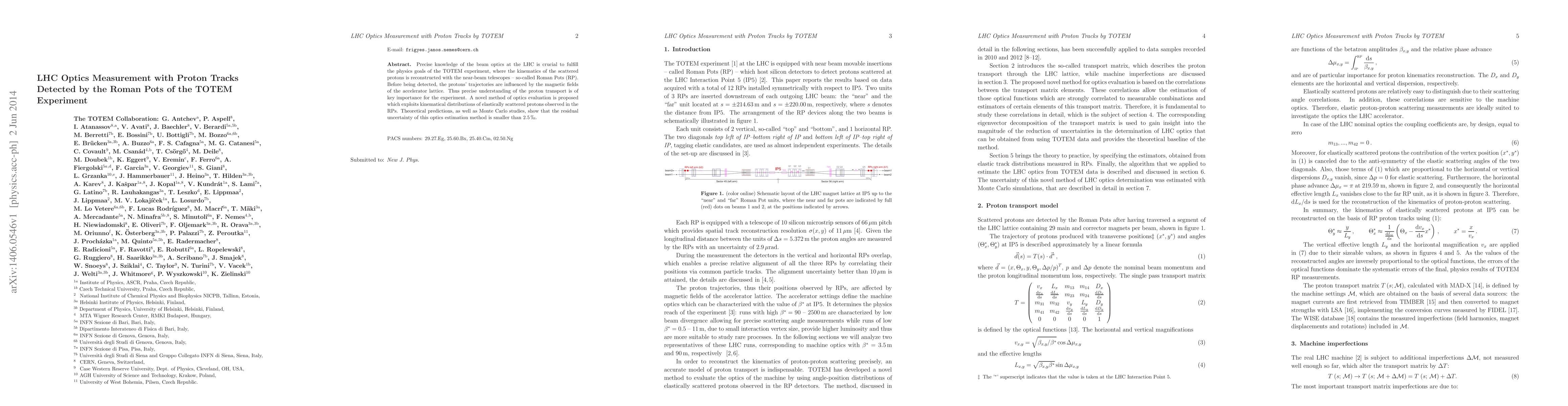 This paper proposes a novel method for evaluating the beam optics at the LHC using proton tracks detected by the Roman Pots of the TOTEM experiment. The method leverages kinematical distributions of elastically scattered protons, demonstrating a residual uncertainty of less than 0.25 percent, crucial for achieving the experiment's physics goals.
