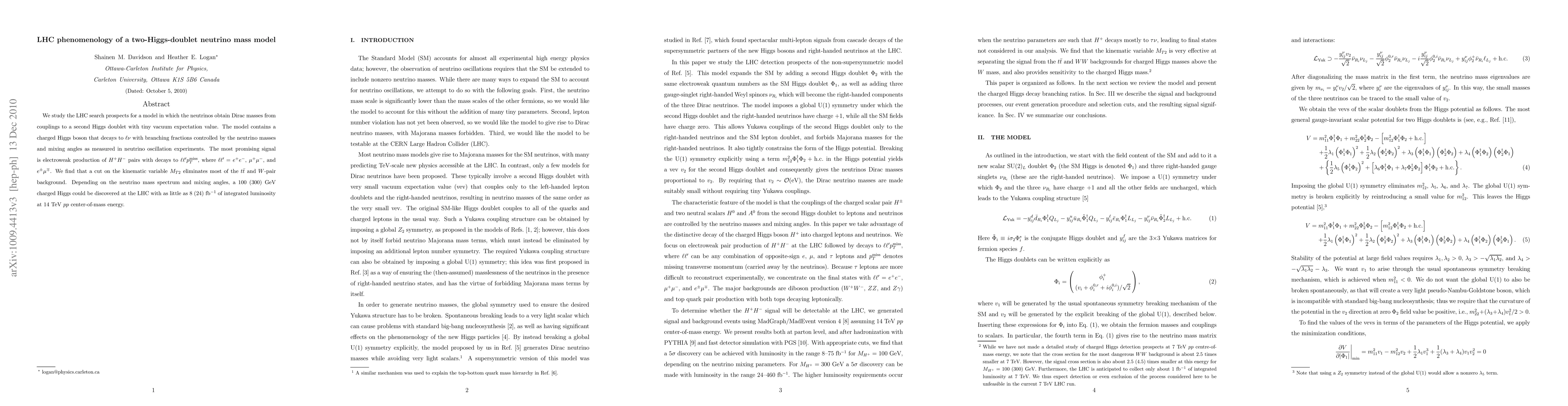 We study the LHC search prospects for a model in which the neutrinos obtain Dirac masses from couplings to a second Higgs doublet with tiny vacuum expectation value. The model contains a charged Higgs boson that decays to l nu with branching fractions controlled by the neutrino masses and mixing angles as measured in neutrino oscillation experiments. The most promising signal is electroweak production of H+ H- pairs with decays to l l' pTmiss, where l l' = e+ e-, mu+ mu-, and e+- mu-+. We find that a cut on the kinematic variable M_{T2} eliminates most of the t t and W-pair background. Depending on the neutrino mass spectrum and mixing angles, a 100 (300) GeV charged Higgs could be discovered at the LHC with as little as 8 (24) fb-1 of integrated luminosity at 14 TeV pp center-of-mass energy.