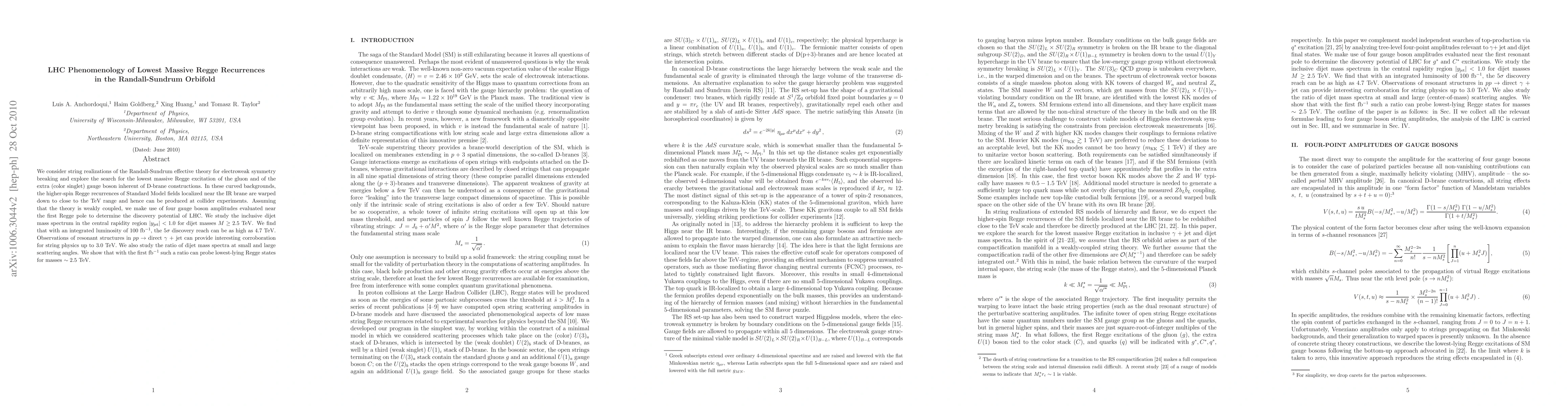 We consider string realizations of the Randall-Sundrum effective theory for electroweak symmetry breaking and explore the search for the lowest massive Regge excitation of the gluon and of the extra (color singlet) gauge boson inherent of D-brane constructions. In these curved backgrounds, the higher-spin Regge recurrences of Standard Model fields localized near the IR brane are warped down to close to the TeV range and hence can be produced at collider experiments. Assuming that the theory is weakly coupled, we make use of four gauge boson amplitudes evaluated near the first Regge pole to determine the discovery potential of LHC. We study the inclusive dijet mass spectrum in the central rapidity region |y_{jet}| < 1.0 for dijet masses M \geq 2.5 TeV. We find that with an integrated luminosity of 100 fb^{-1}, the 5\sigma discovery reach can be as high as 4.7 TeV. Observations of resonant structures in pp \rightarrow direct \gamma + jet can provide interesting corroboration for string physics up to 3.0 TeV. We also study the ratio of dijet mass spectra at small and large scattering angles. We show that with the first fb^{-1} such a ratio can probe lowest-lying Regge states for masses \sim 2.5 TeV.