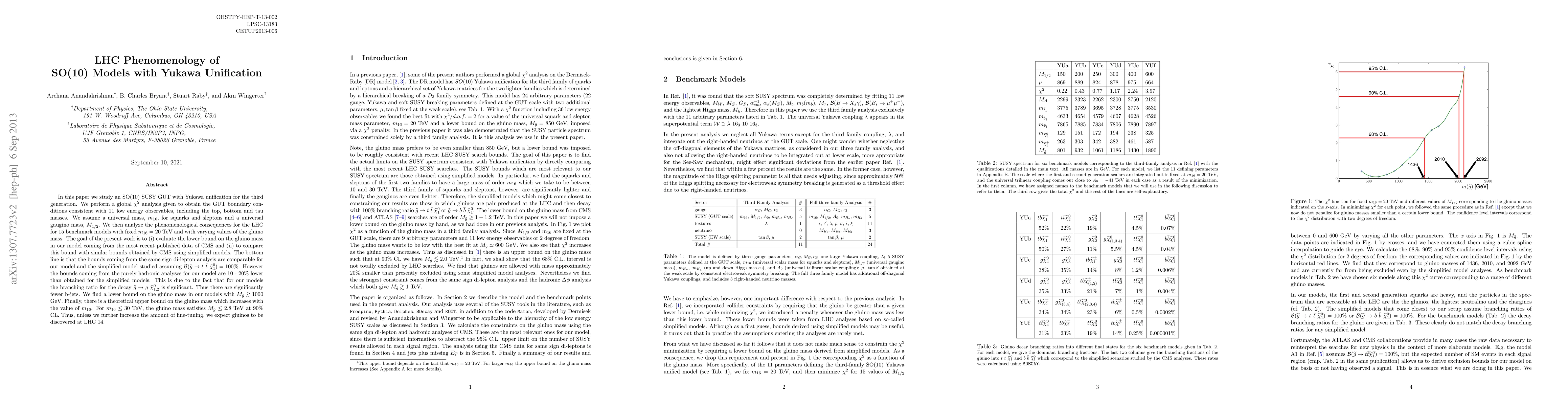 This paper explores an SO(10) SUSY GUT with Yukawa unification for the third generation, analyzing the LHC phenomenology for 15 benchmark models. It finds a lower bound on the gluino mass of M_{gluino} > 1000 GeV, with bounds from hadronic analyses being 10-20% lower than simplified models due to significant branching ratios for gluino decay into neutralinos.